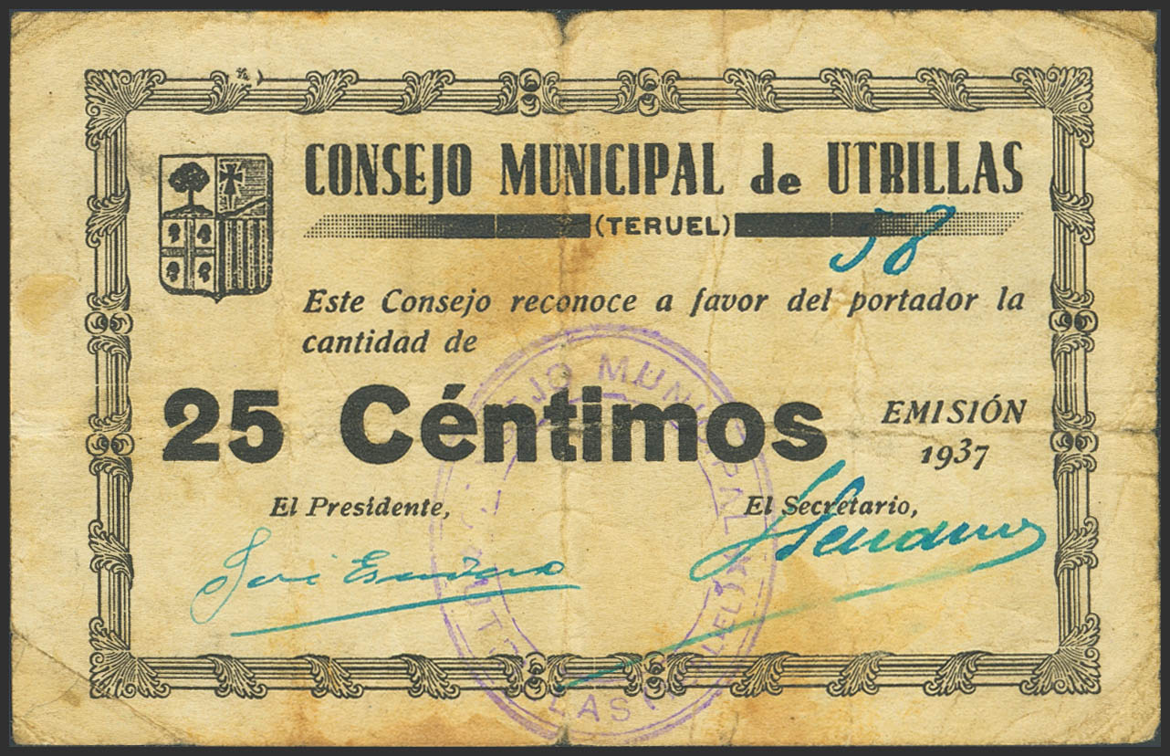 UTRILLAS (TERUEL). 25 Céntimos. 1937. (González: 5252). Raro. BC+.