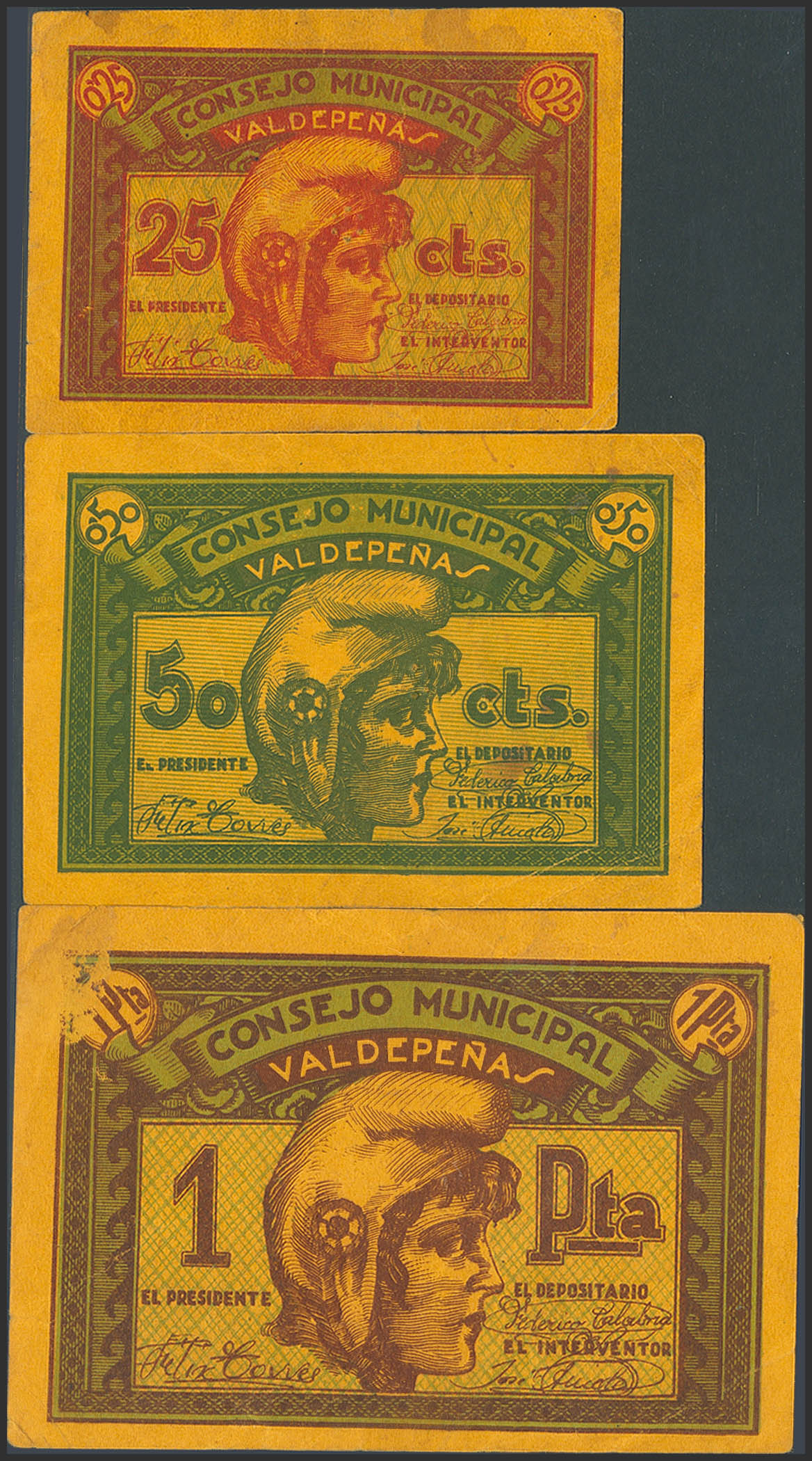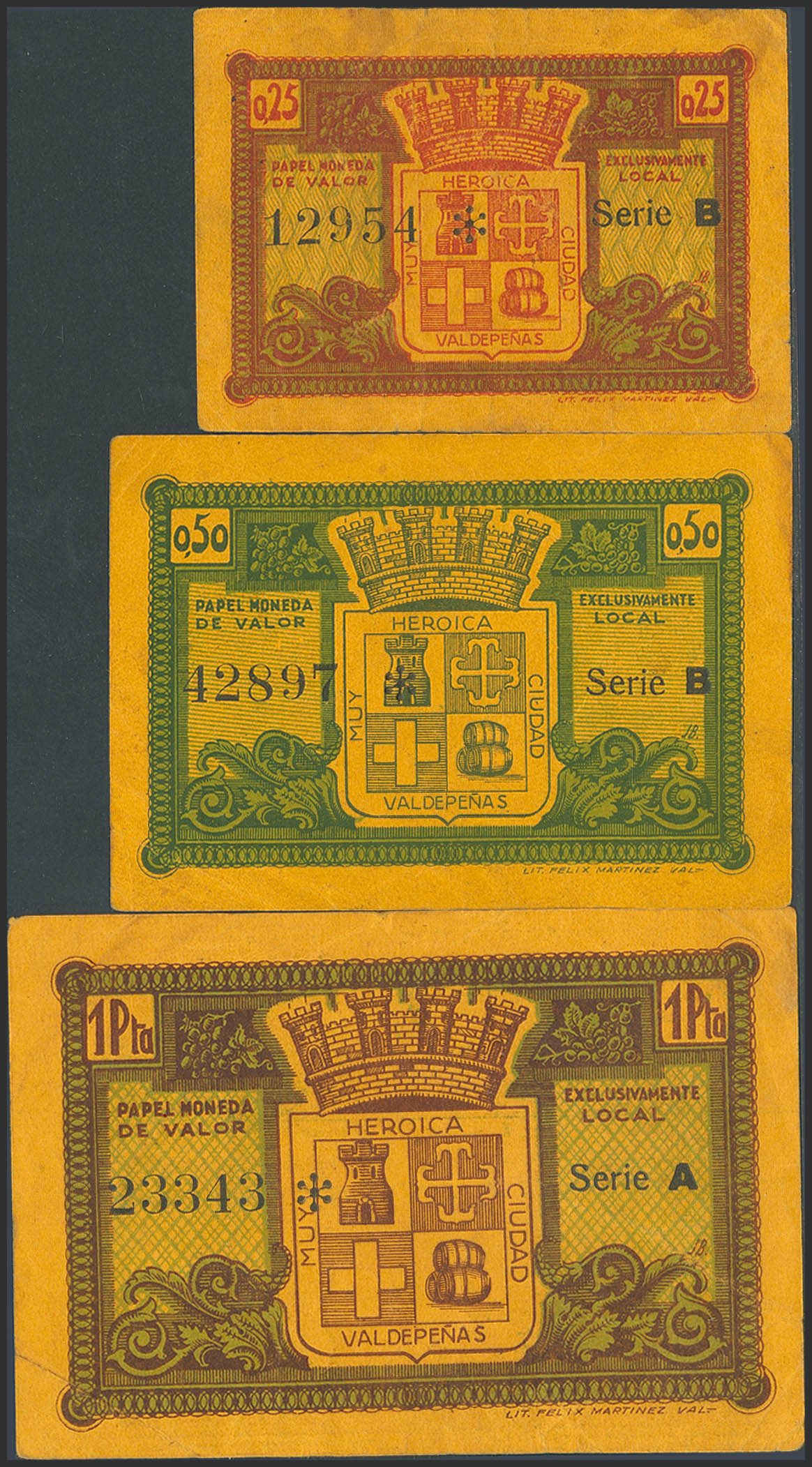 VALDEPEÑAS (CIUDAD REAL). 25 Céntimos, 50 Céntimos y 1 Peseta. (1937ca). Serie B, B y A, todos. (González: 5281/83). Serie completa. MBC+.