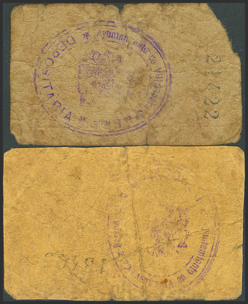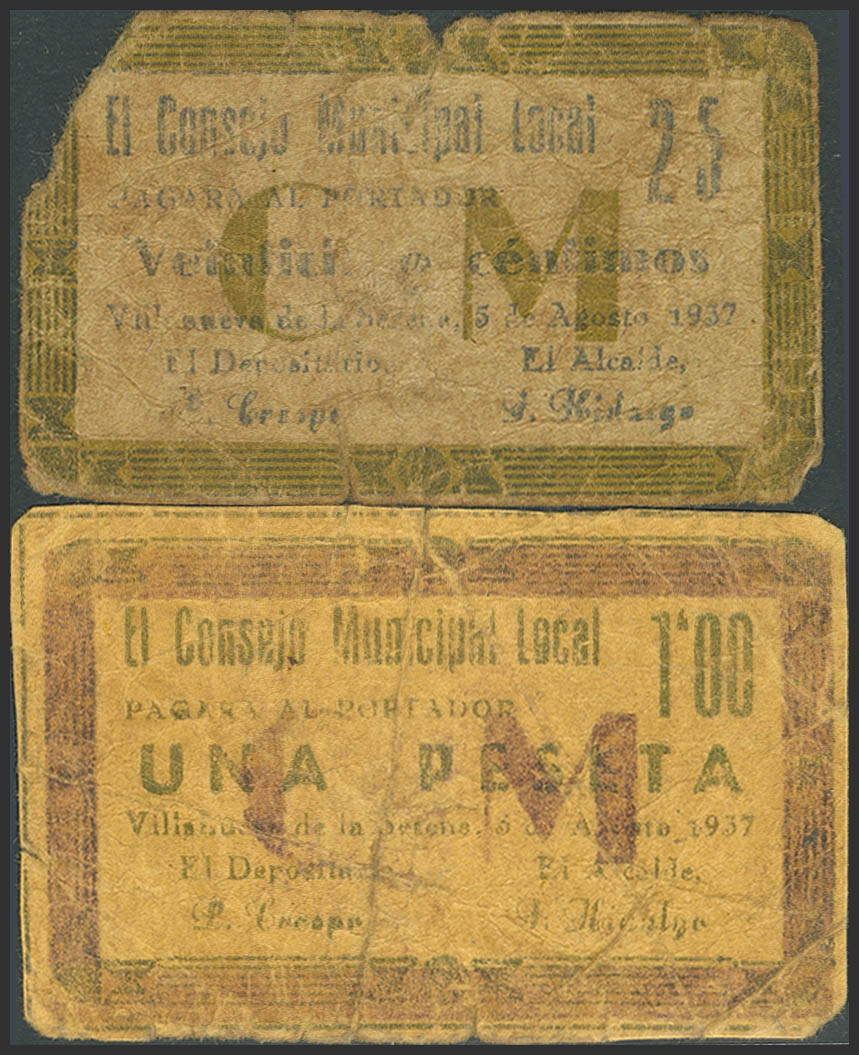 VILLANUEVA DE LA SERENA (BADAJOZ). 25 Céntimos y 1 Peseta. 5 de Agosto de 1937. (González: 5648, 5649). Raros. RC.