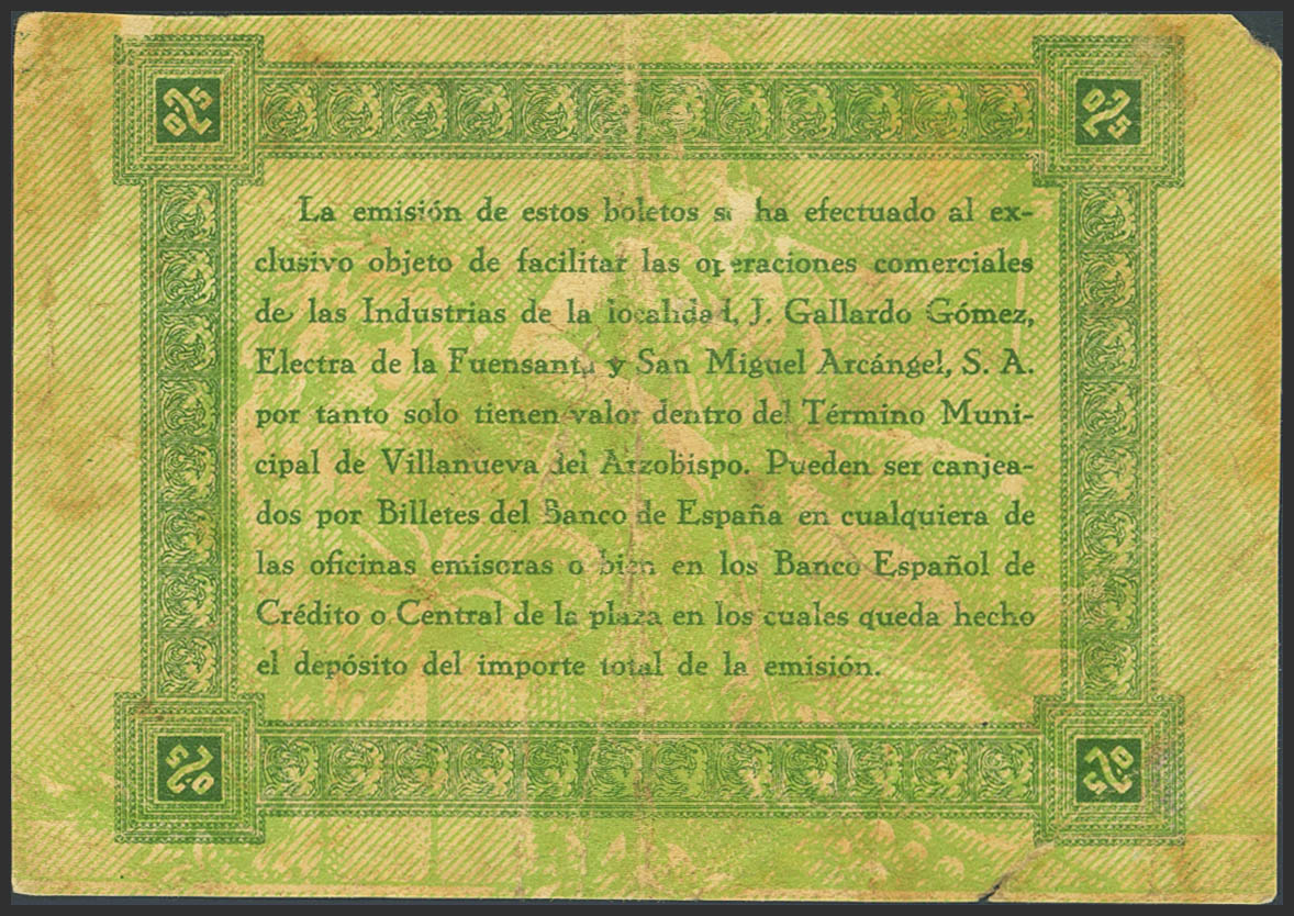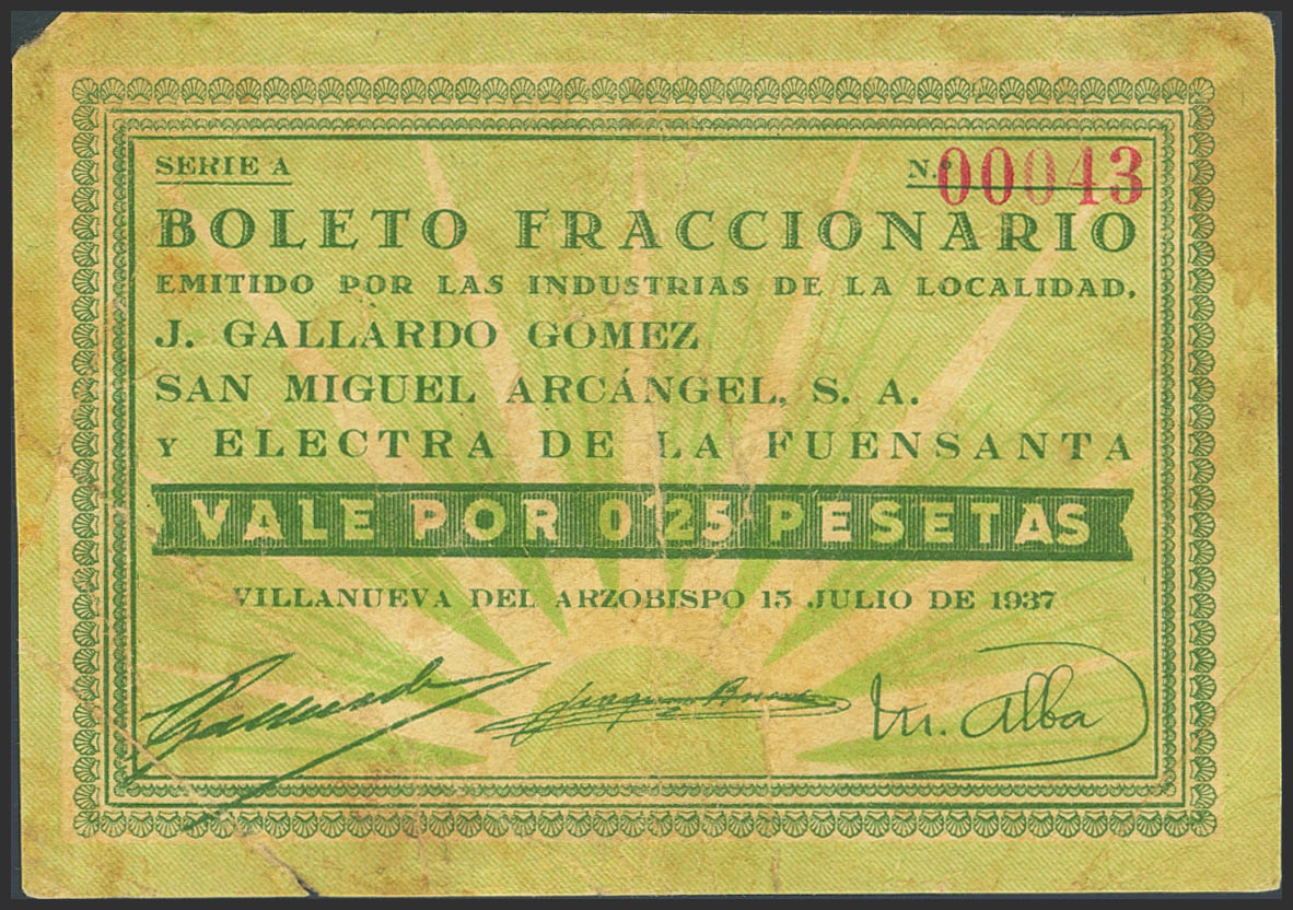 VILLANUEVA DEL ARZOBISPO (JAEN). 25 Céntimos. 15 de Julio de 1937. Numeración 00043. (González: 5663). Inusual. MBC-.