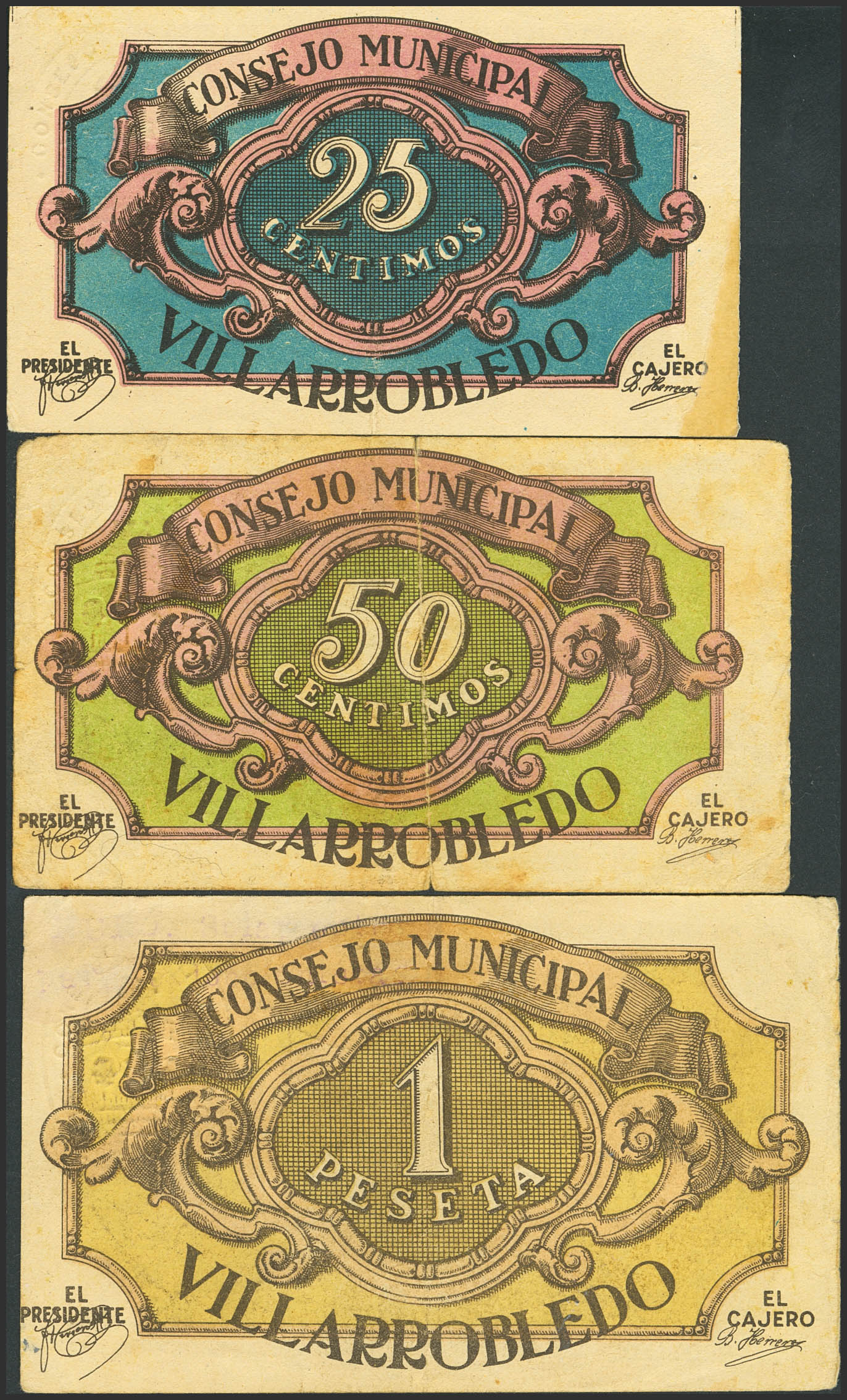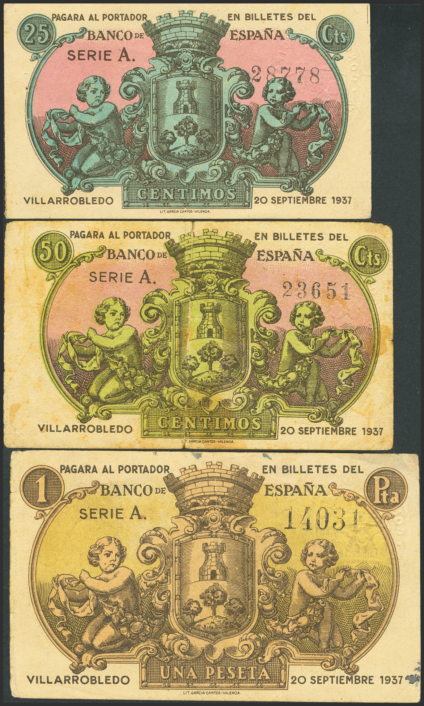 VILLAROBLEDO (ALBACETE). 25 Céntimos, 50 Céntimos y 1 Peseta. 20 de Septiembre de 1937. (González: 5731/33). Serie completa. MBC-.