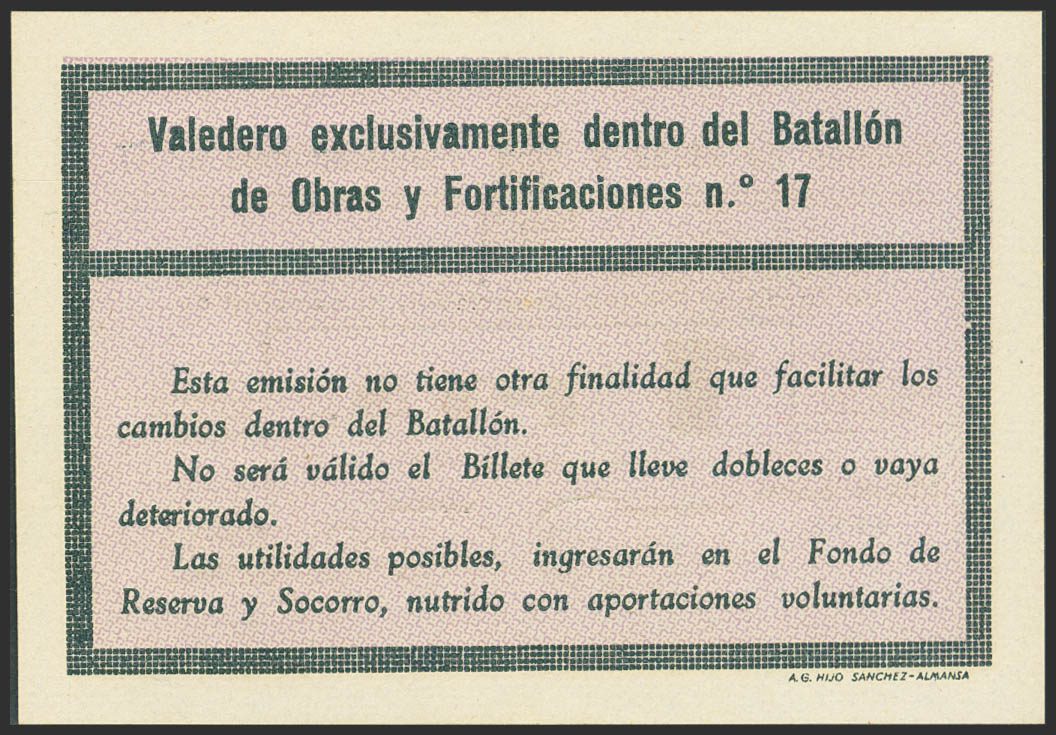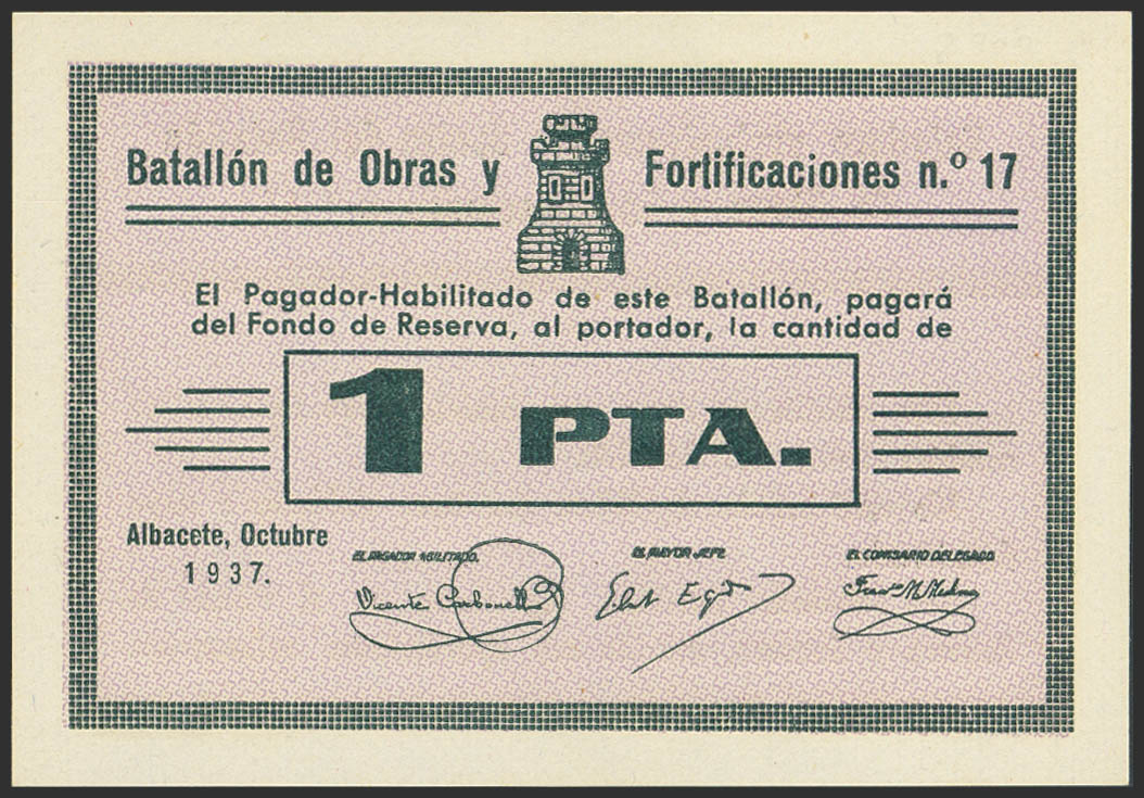 ALBACETE. 1 Peseta. Octubre de 1937. Batallón de Obras y Fortificaciones. (González: 5892). Inusual especialmente en esta calidad. SC.