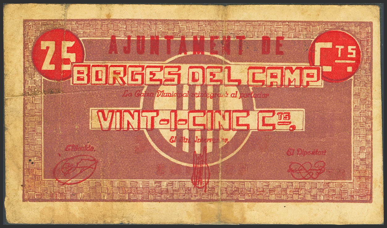 BORGUES DEL CAMP (TARRAGONA). 25 Céntimos. (1937ca). (González: 7163). Raro. BC-.