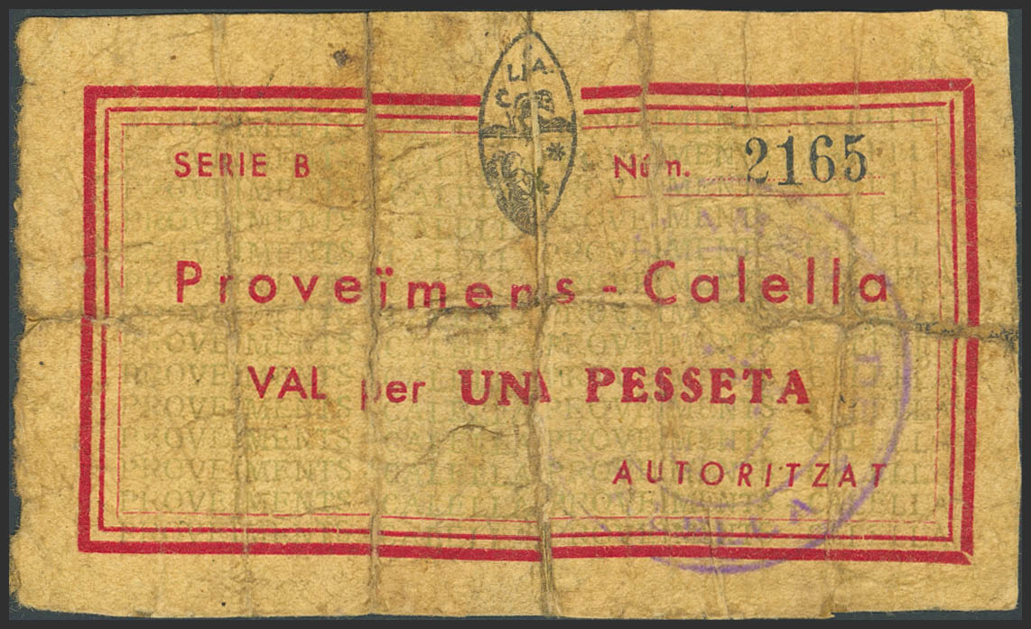 CALELLA (BARCELONA). 1 Peseta. (1937ca). Serie B. (González: 7289). Inusual, sobre cartón de la época. RC-.