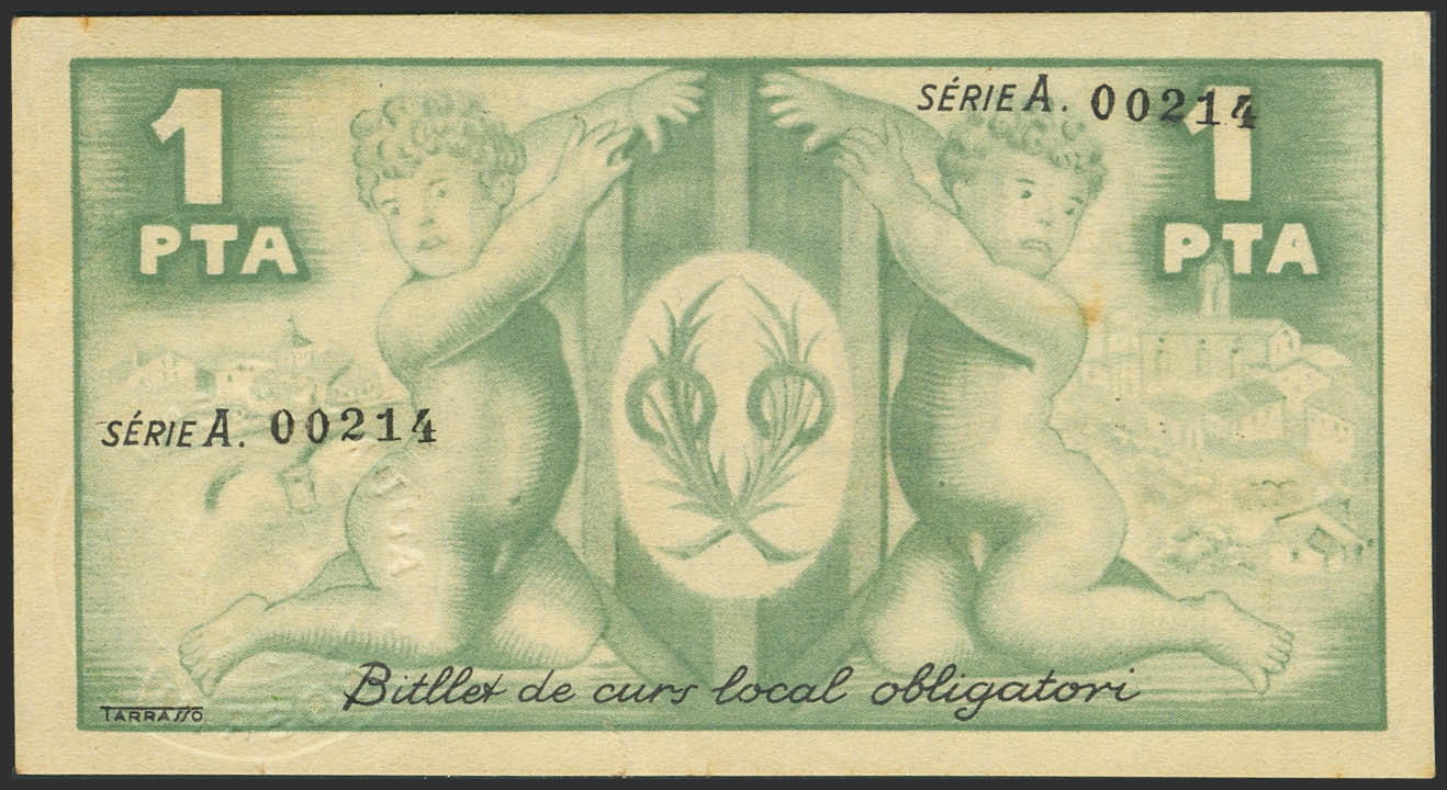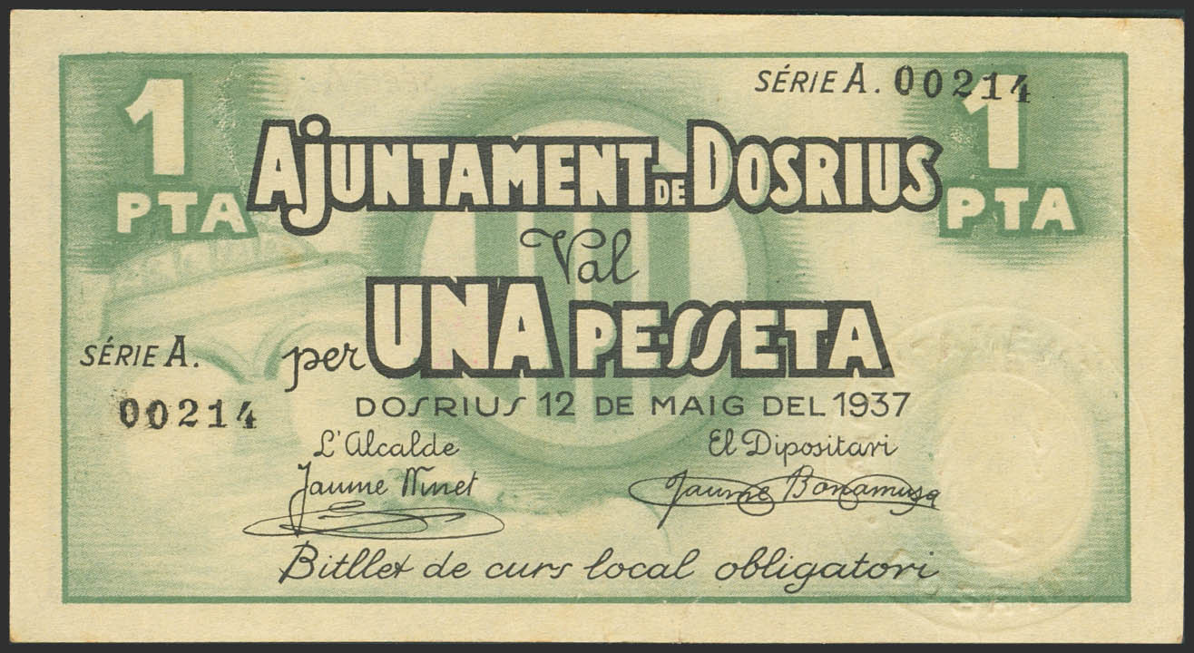 DOSRIUS (BARCELONA). 1 Peseta. 12 de Mayo de 1937. Serie A. (González: 7722). Raro. EBC.