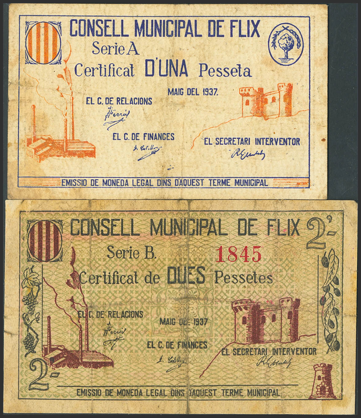 FLIX (TARRAGONA). 1 Peseta y 2 Pesetas. Mayo de 1937. Serie A y B, respectivamente. (González: 7883/84). Rara serie completa, 2 pts presencia de cinta adhesiva. RC+/MBC-.