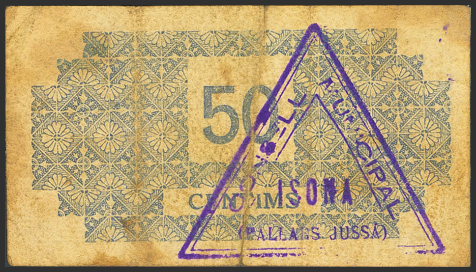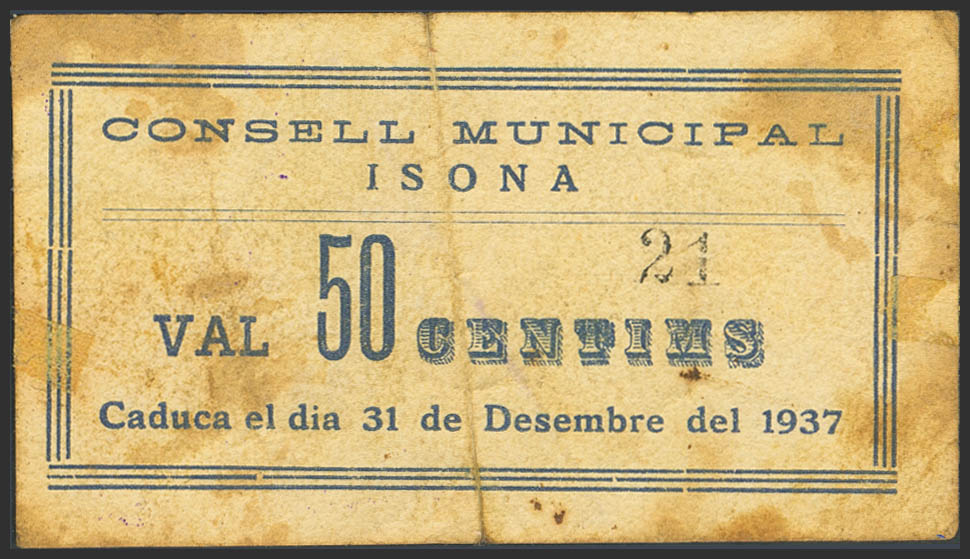 ISONA (LERIDA). 50 Céntimos. (1937ca). (González: 8263). Inusual. BC-.