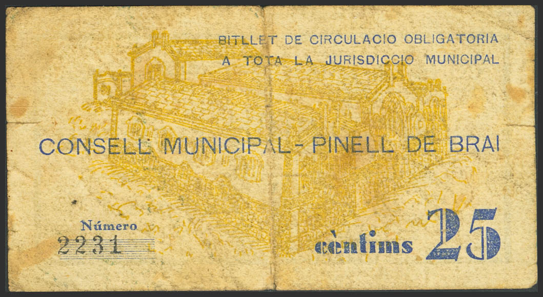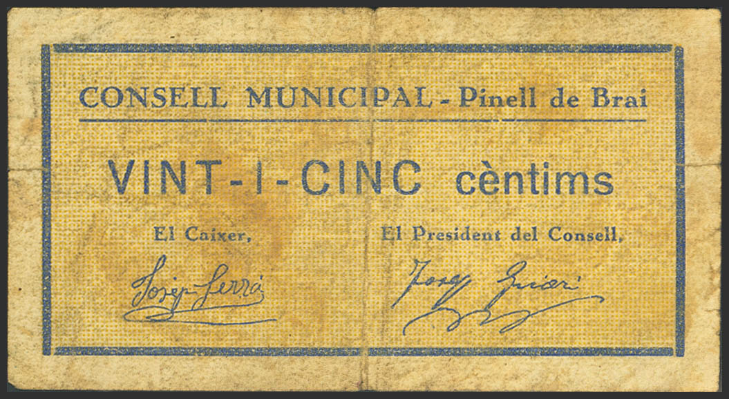 PINELL DE BRAI (TARRAGONA). 25 Céntimos. (1937ca). (González: 9238). Muy raro. MBC-.