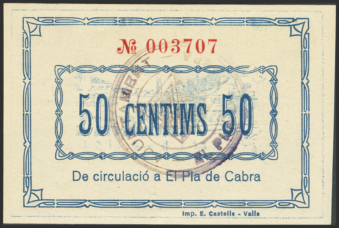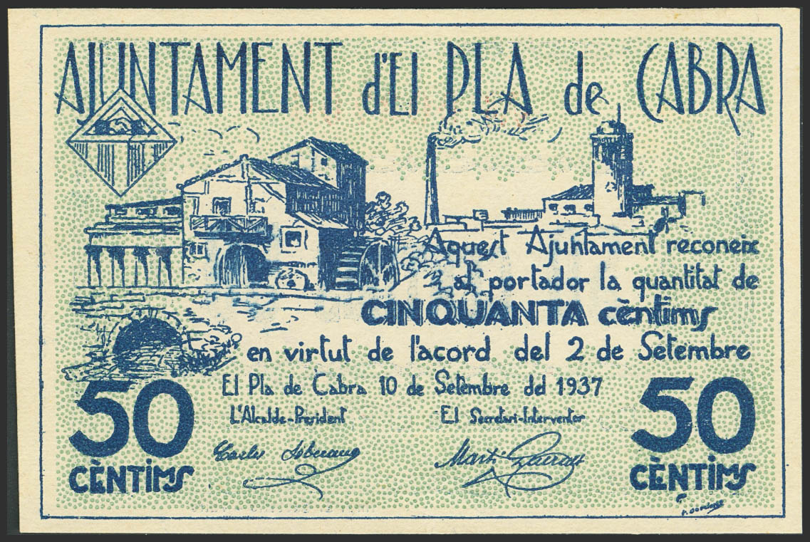 PLA DE CABRA (TARRAGONA). 50 Céntimos. 10 de Septiembre de 1937. (González: 9250). Raro, especialmente en esta calidad. SC-.
