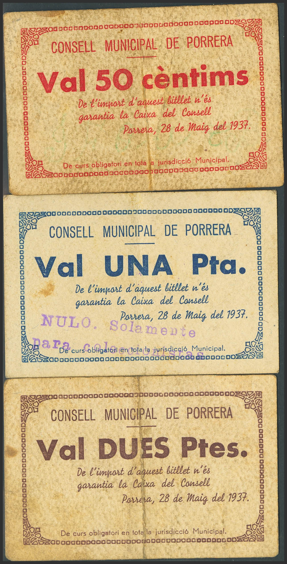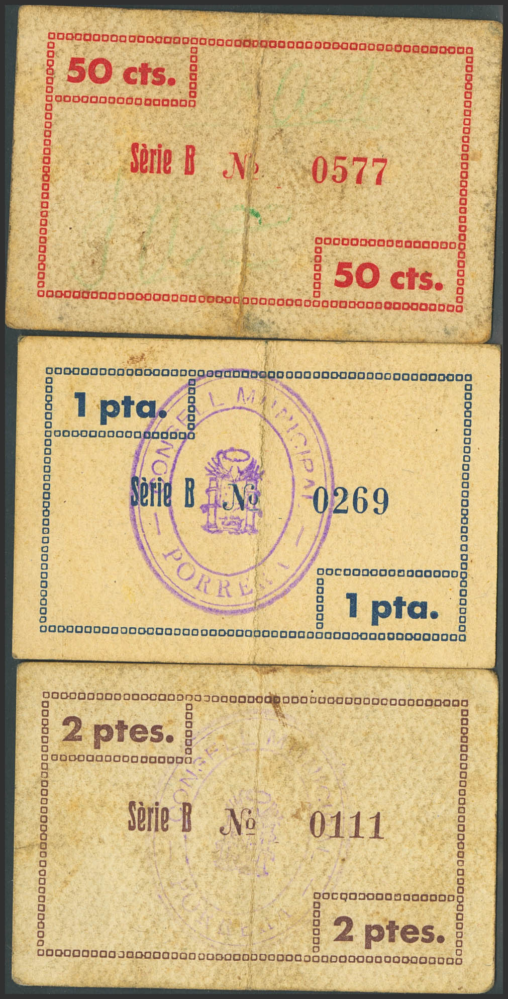 PORRERA (TARRAGONA). 50 Céntimos, 1 Peseta y 2 Pesetas. 28 de Mayo de 1937. Serie B, todos. (González: 9399/01). Rara serie completa. MBC+.