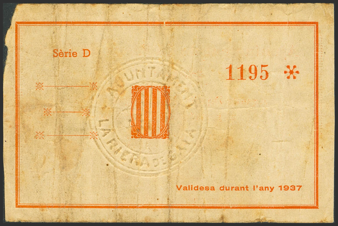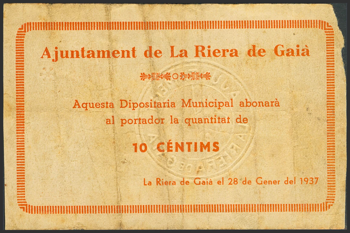 RIERA DE GAIA (TARRAGONA). 10 Céntimos. 28 de Enero de 1937. Serie D. (González: 9632). Muy raro. BC+.