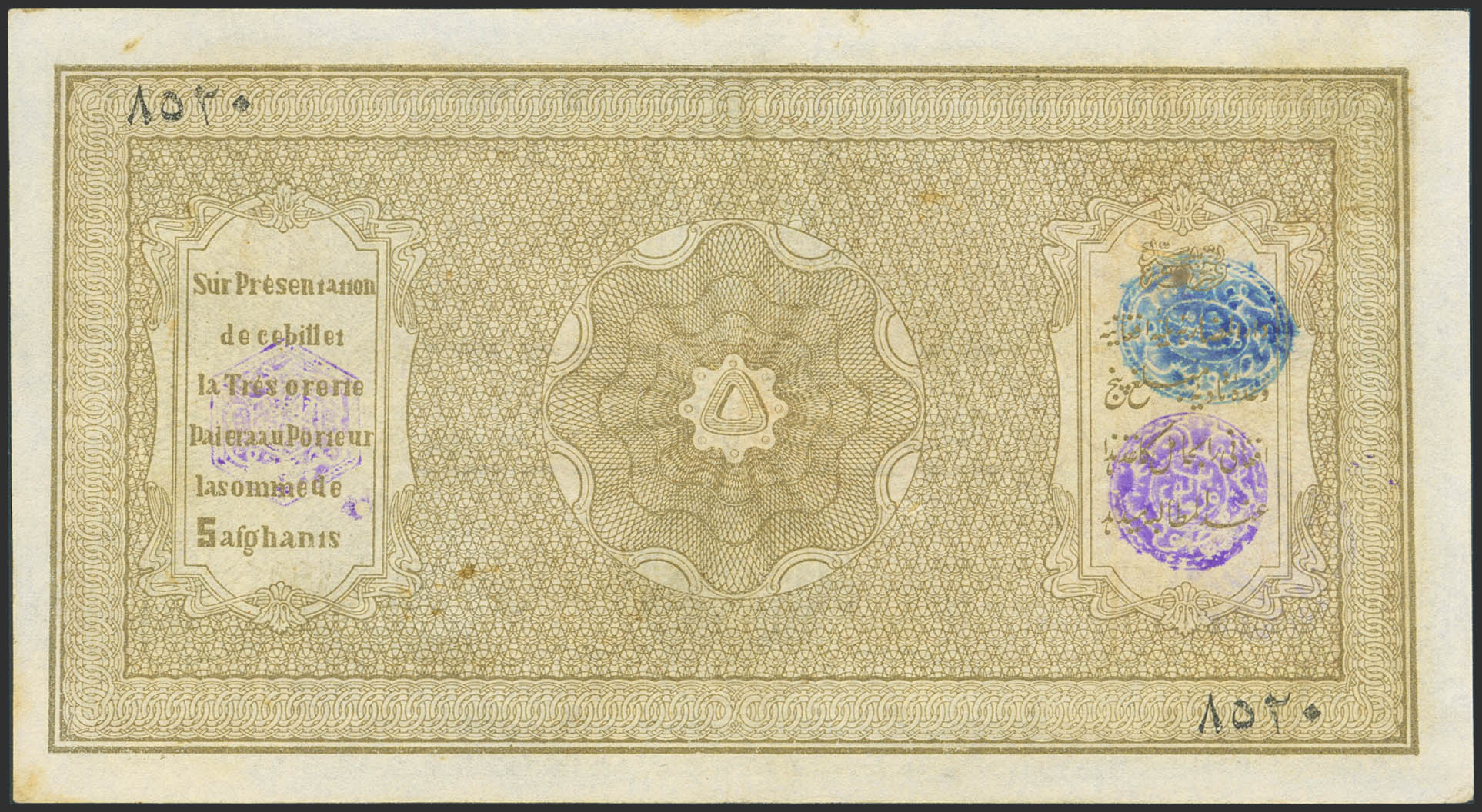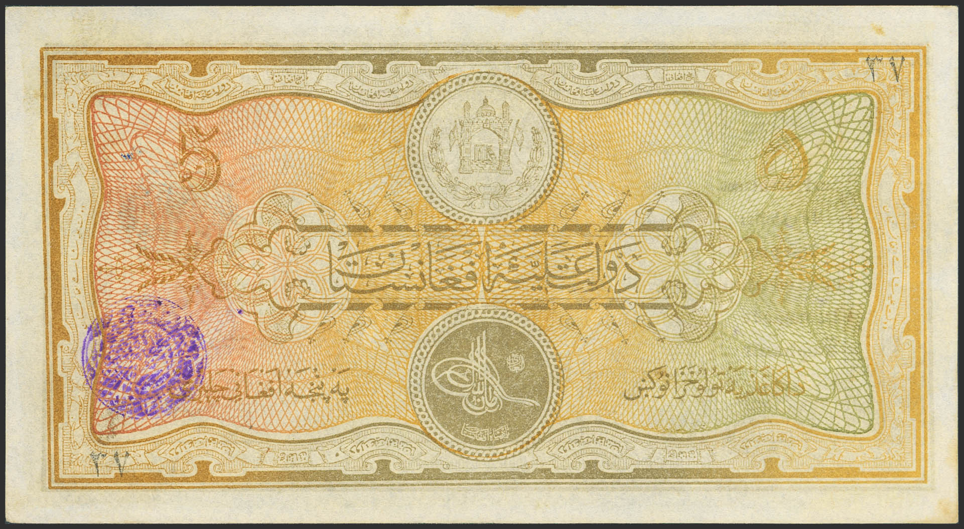 AFGHANISTAN. 5 Afghanis. 1928. Treasury. Revalidated with handstamps from the 'Baccha i Saqao' Revolution. (Pick: 11). Extremely Fine.