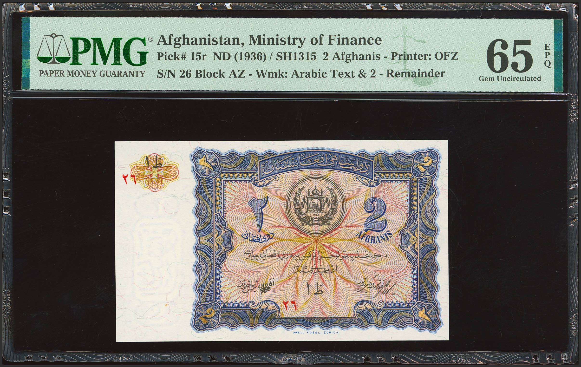 AFGHANISTAN. 2 Afghanis. 1936. Ministry of Finance. Remainder. (Pick: 15r). PMG65EPQ.