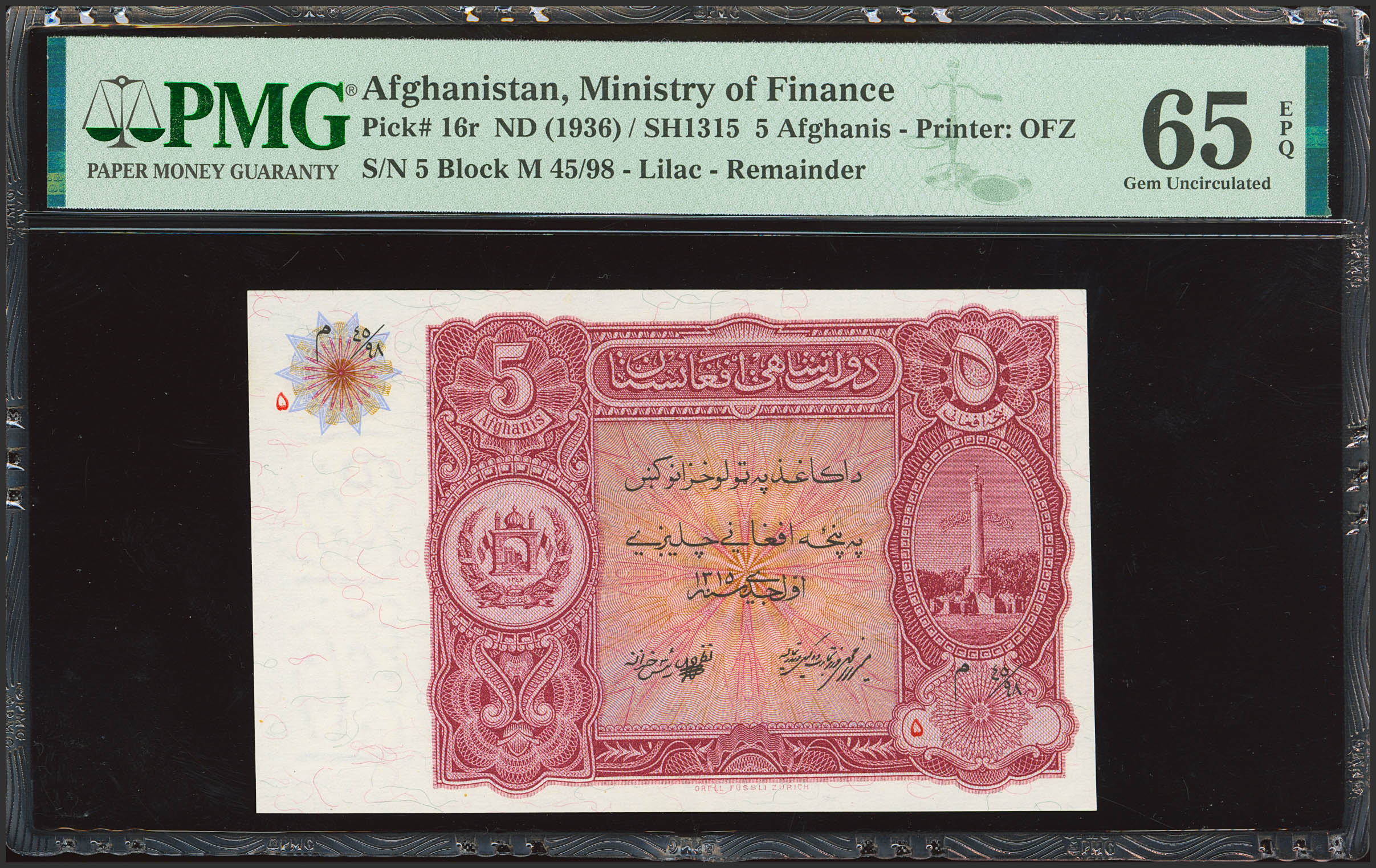 AFGHANISTAN. 5 Afghanis. 1936. Ministry of Finance. Remainder. (Pick: 16r). PMG65EPQ.