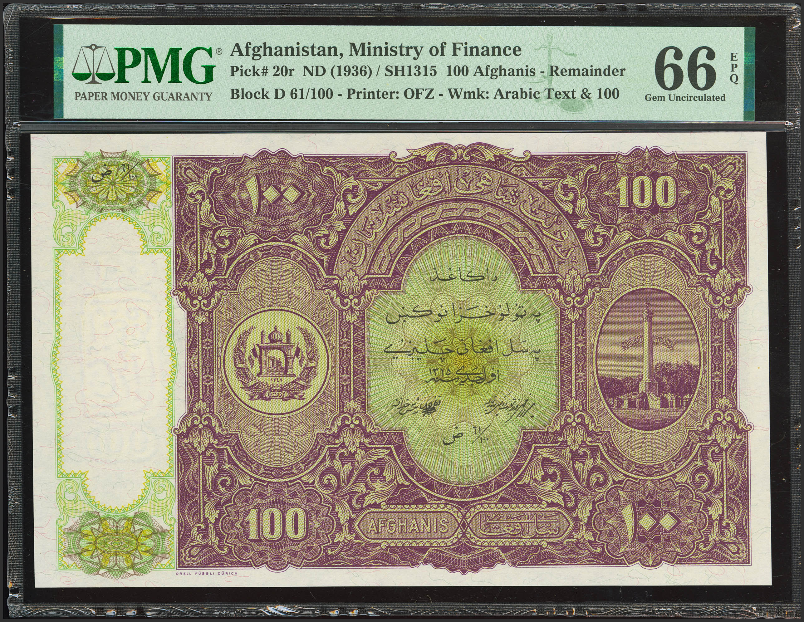 AFGHANISTAN. 100 Afghanis. 1936. Ministry of Finance. Remainder. (Pick: 20r). PMG66EPQ.