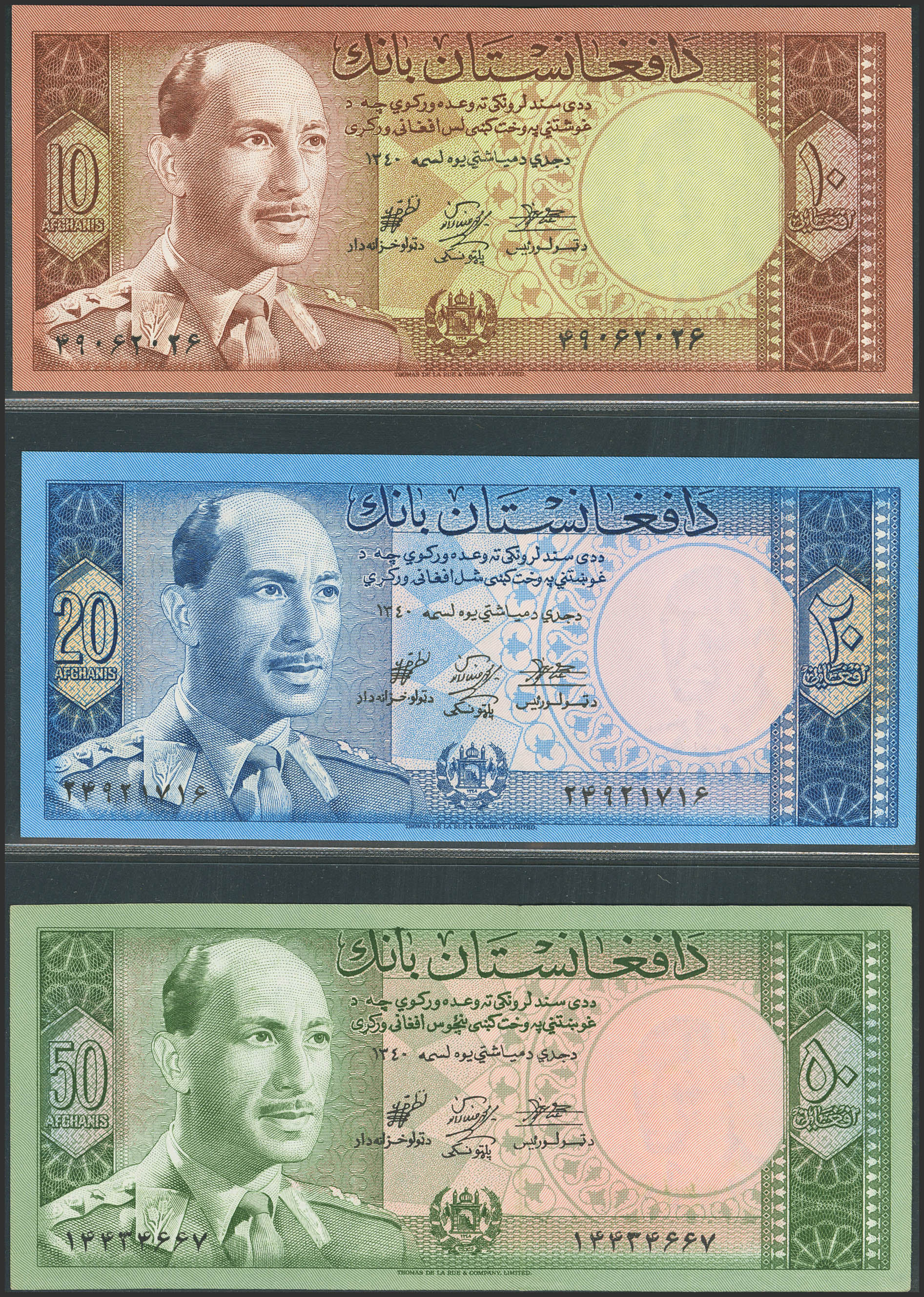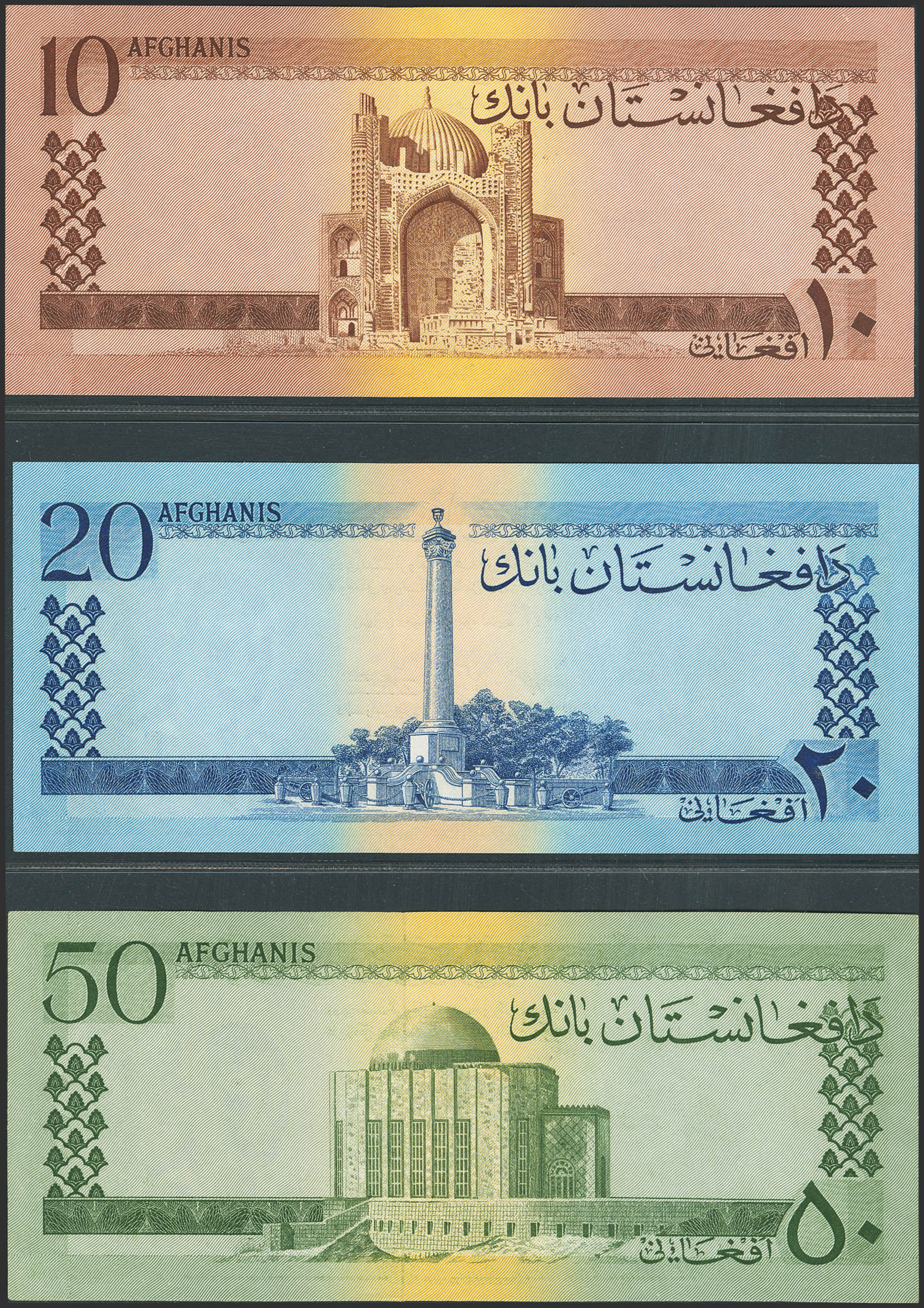 AFGHANISTAN. Lot of 3 notes from 10 at 50 Afghanis. 1961. Da Afghanistan Bank. (Pick: 37a, 38, 39). Uncirculated.