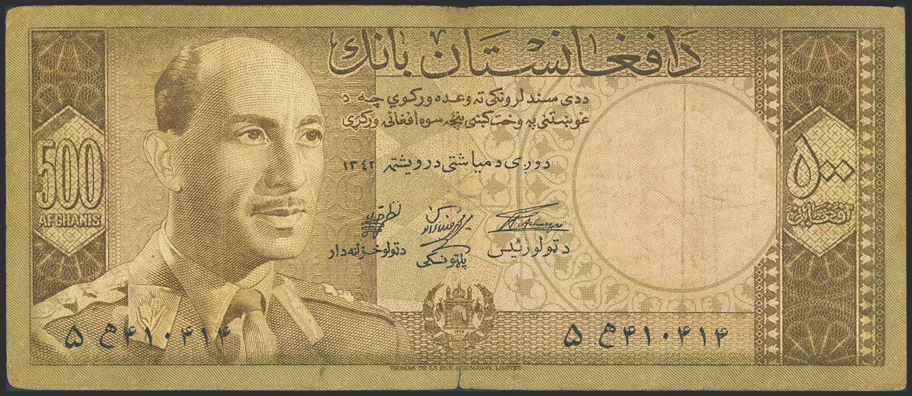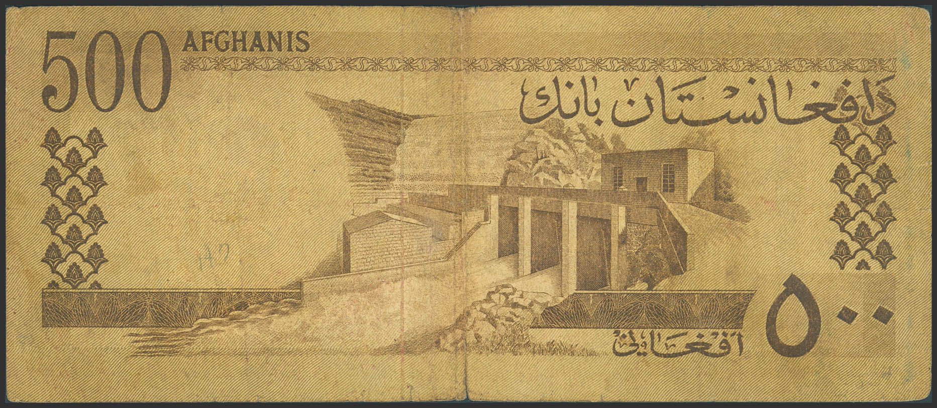AFGHANISTAN. 500 Afghanis. 1963. Da Afghanistan Bank. (Pick: 41b). Tears, 1 cm tear on the central fold. Writing on the back. Very Fine.