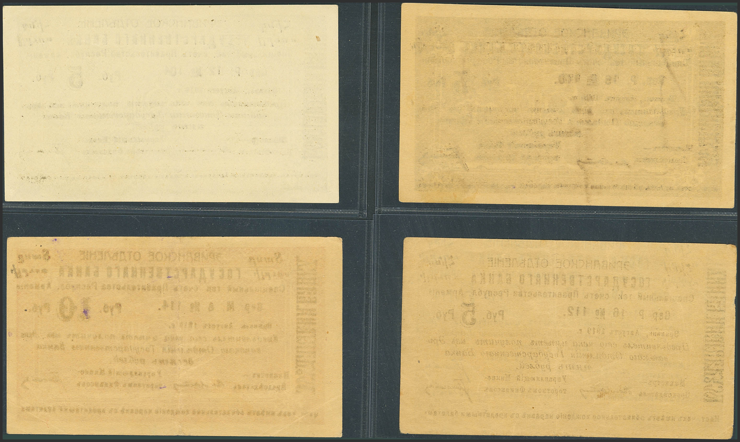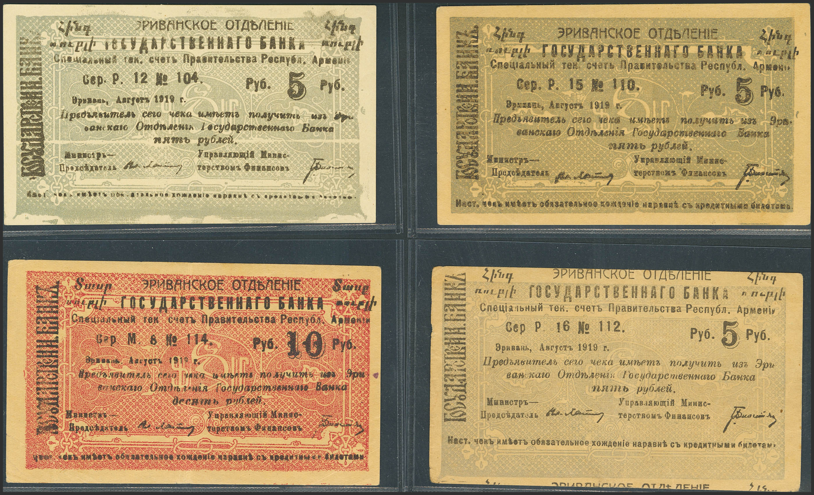ARMENIA. Lot of 4 notes of 5 and 10 Rubley. August 1919. Erivan Branch of Government Bank. (Pick: 14). More than Extremely Fine / Less than Uncirculated.
