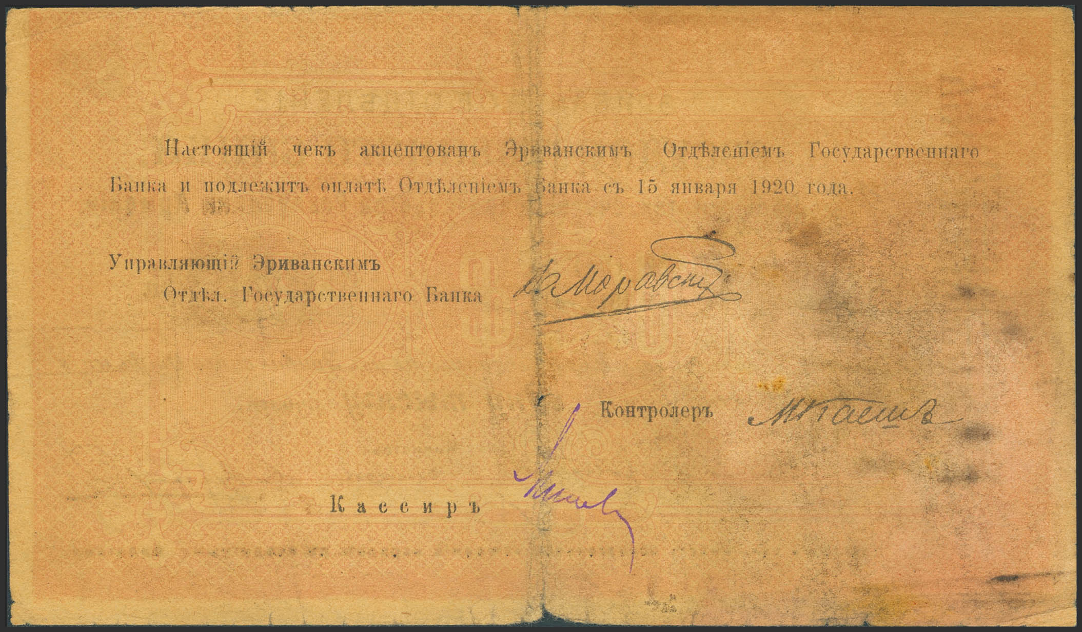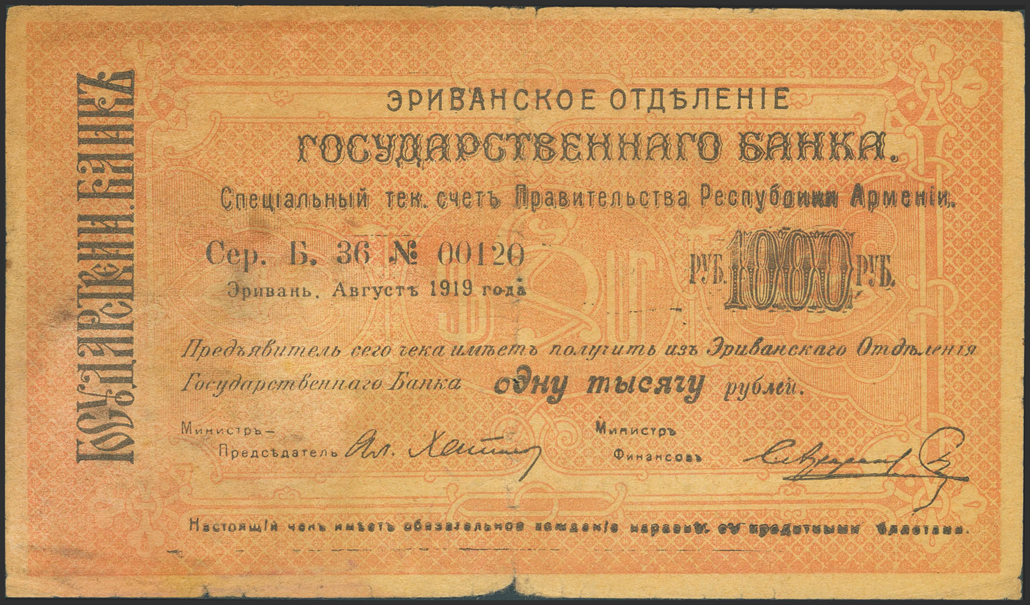 ARMENIA. 1000 Rubley. August 1919. Erivan Branch of Government Bank. (Pick: 27b). Very Fine.