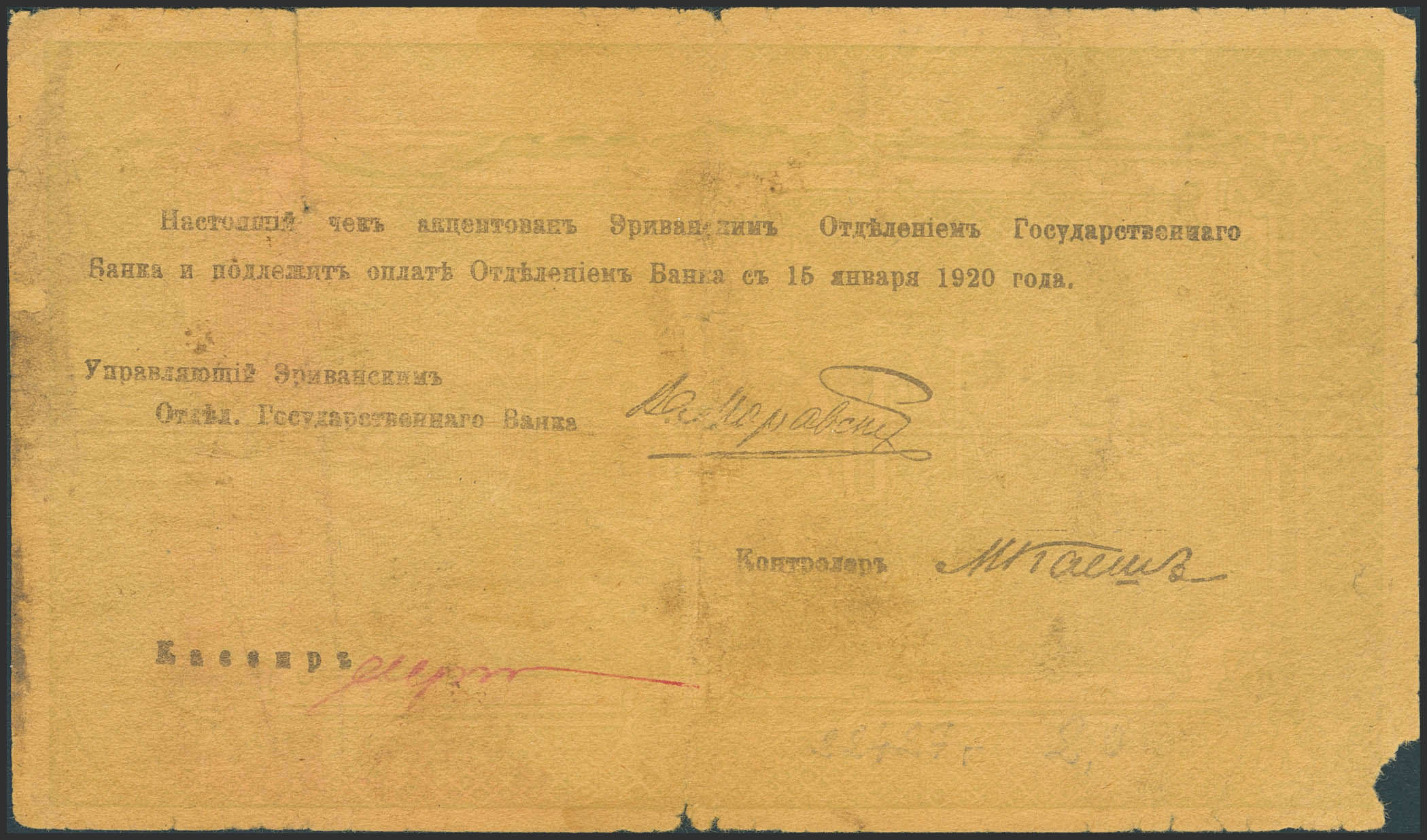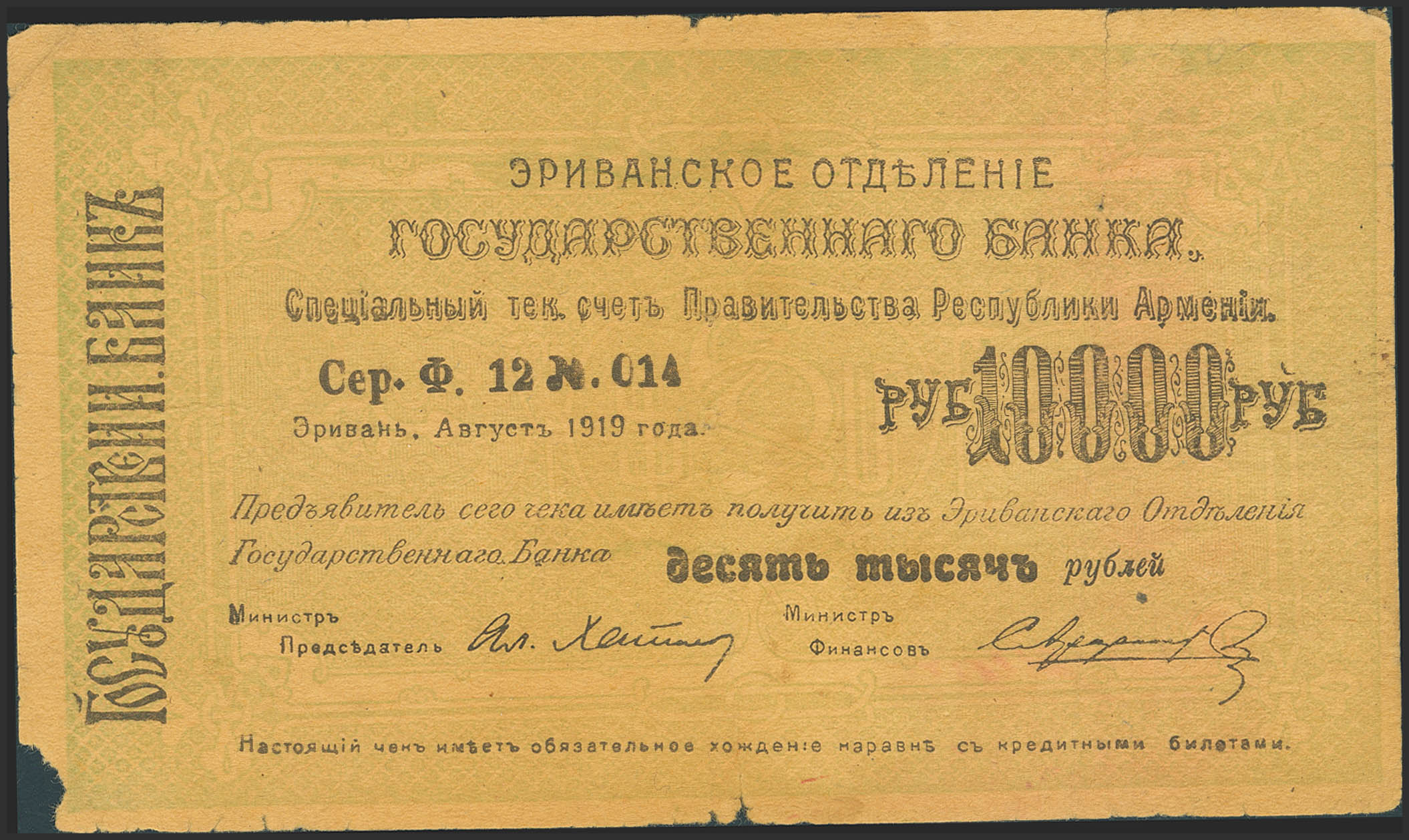 ARMENIA. 10000 Rubley. August 1919. Erivan Branch of Government Bank. (Pick: 29a). More than Very Fine, pinholes, tears, corner missing.