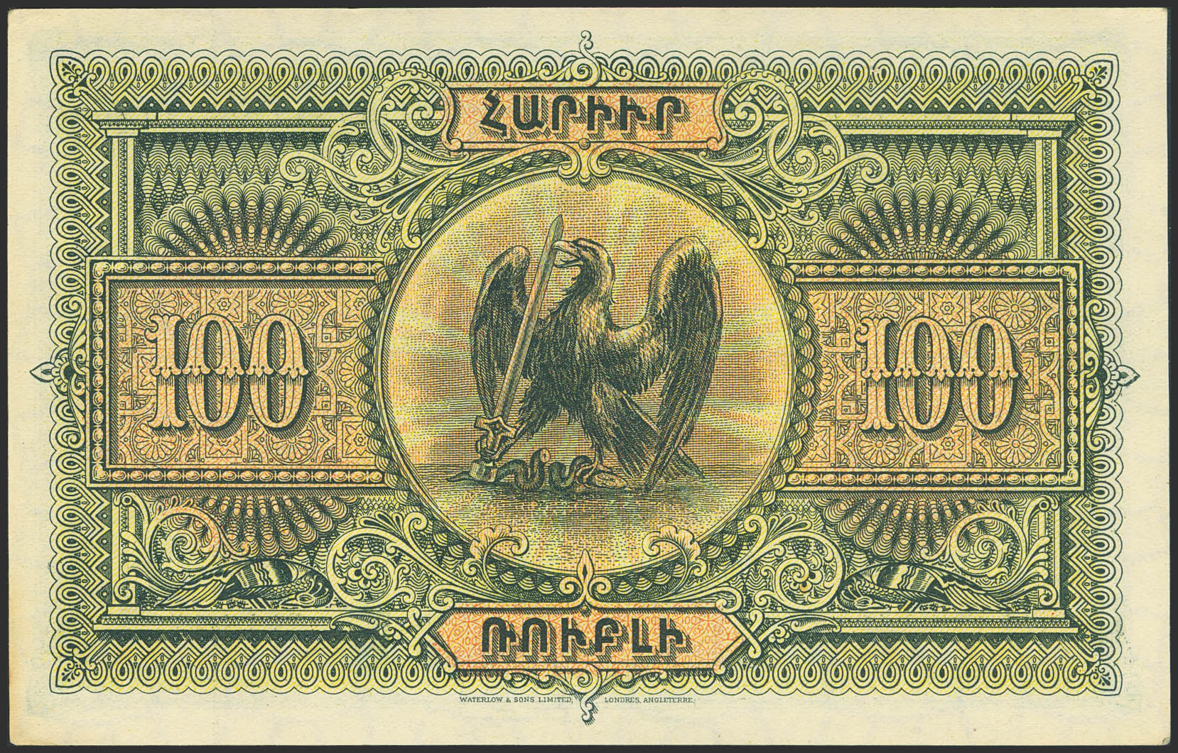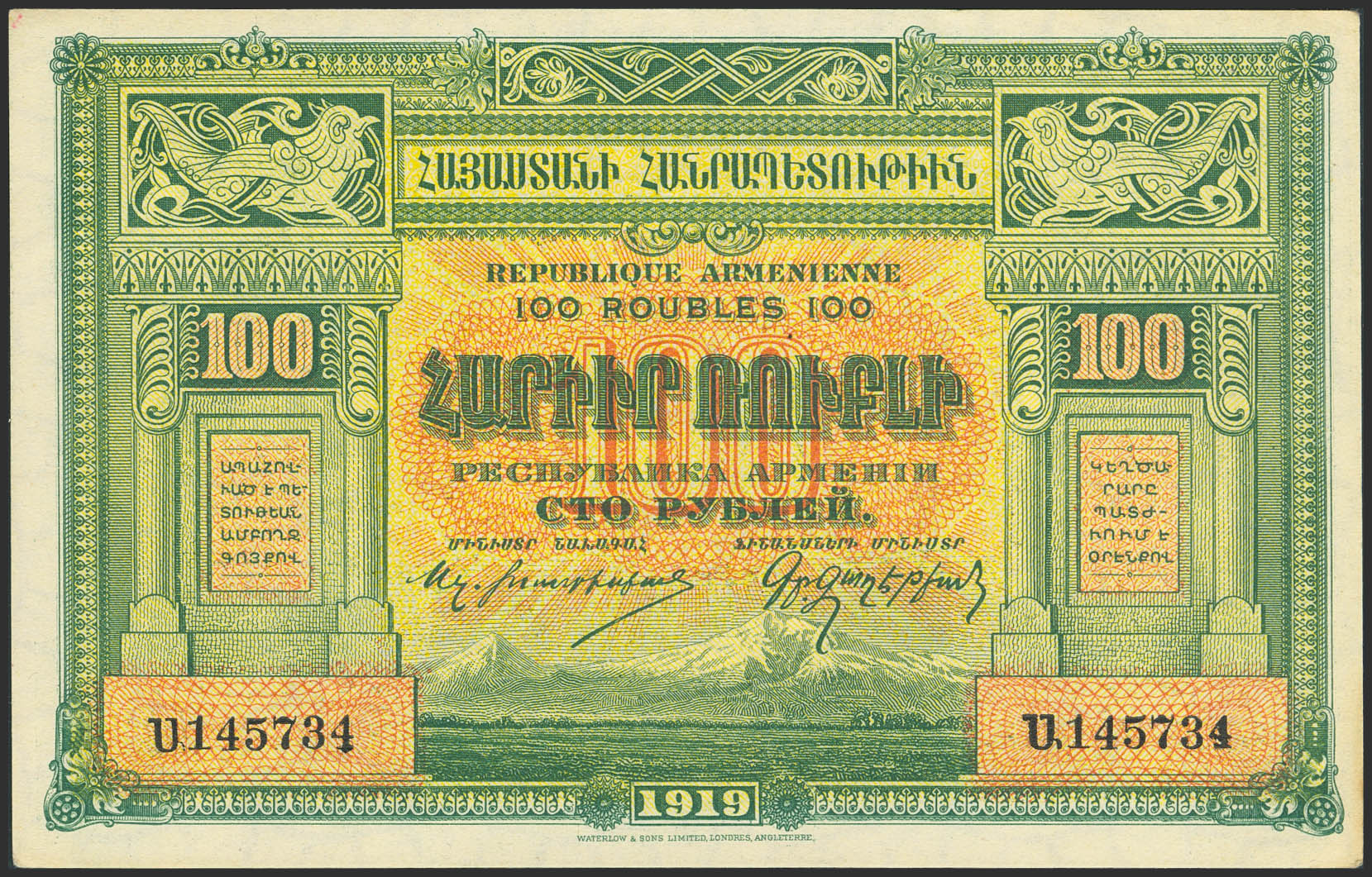 ARMENIA. 100 Rubley. 1919. Republique Armenienne. (Pick: 31). Minor handling marks. Less than Uncirculated.