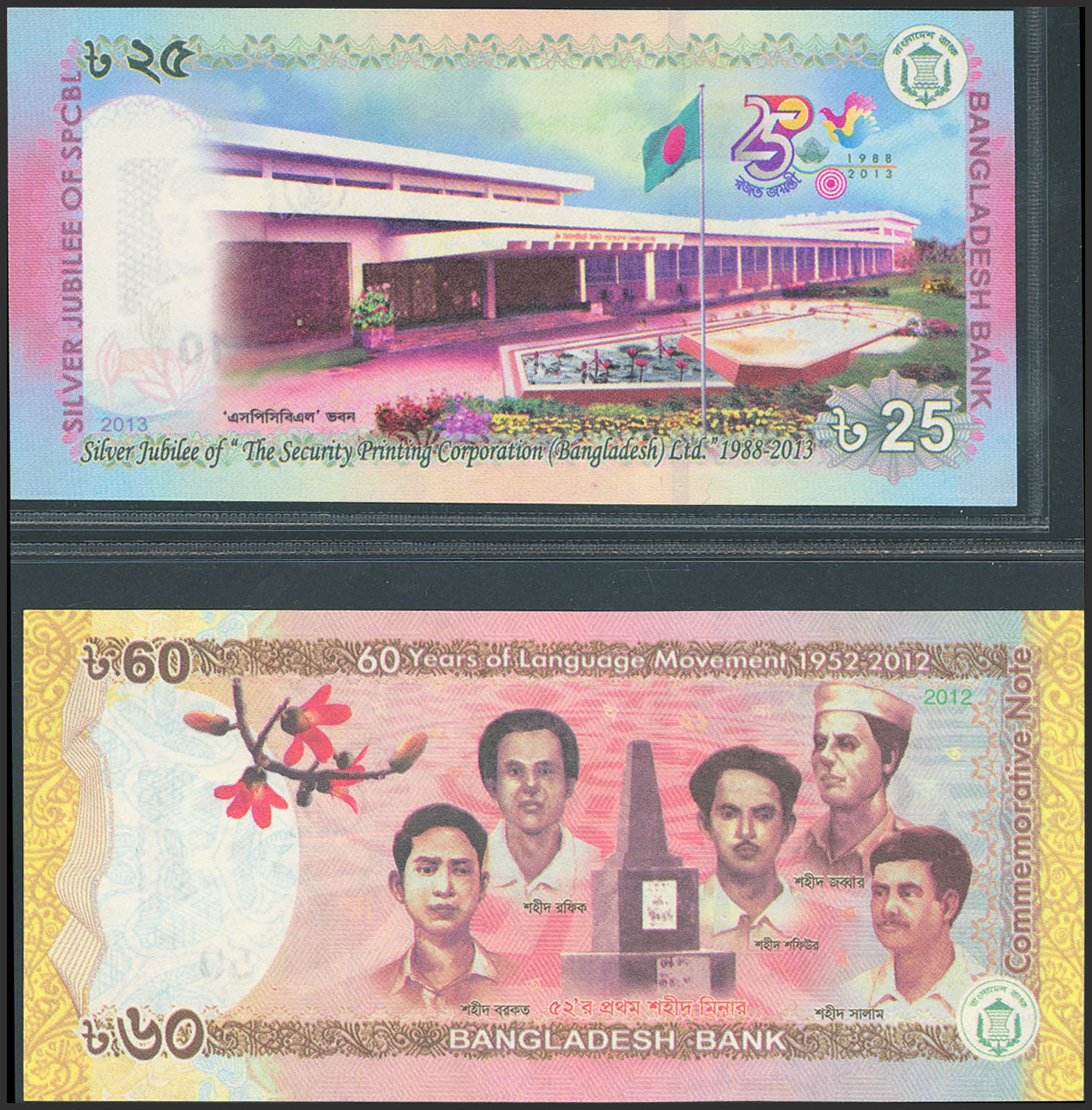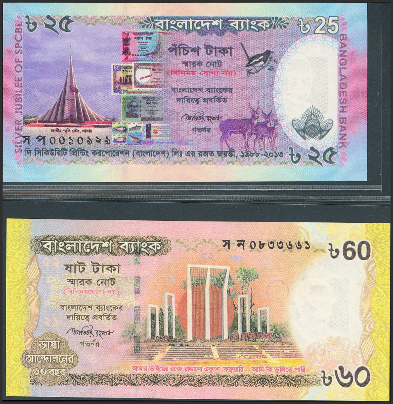 BANGLADESH. Lot of 2 notes of 25 and 60 Taka. 2012 and 2013. Bangladesh Bank. (Pick: 61, 62). Uncirculated.