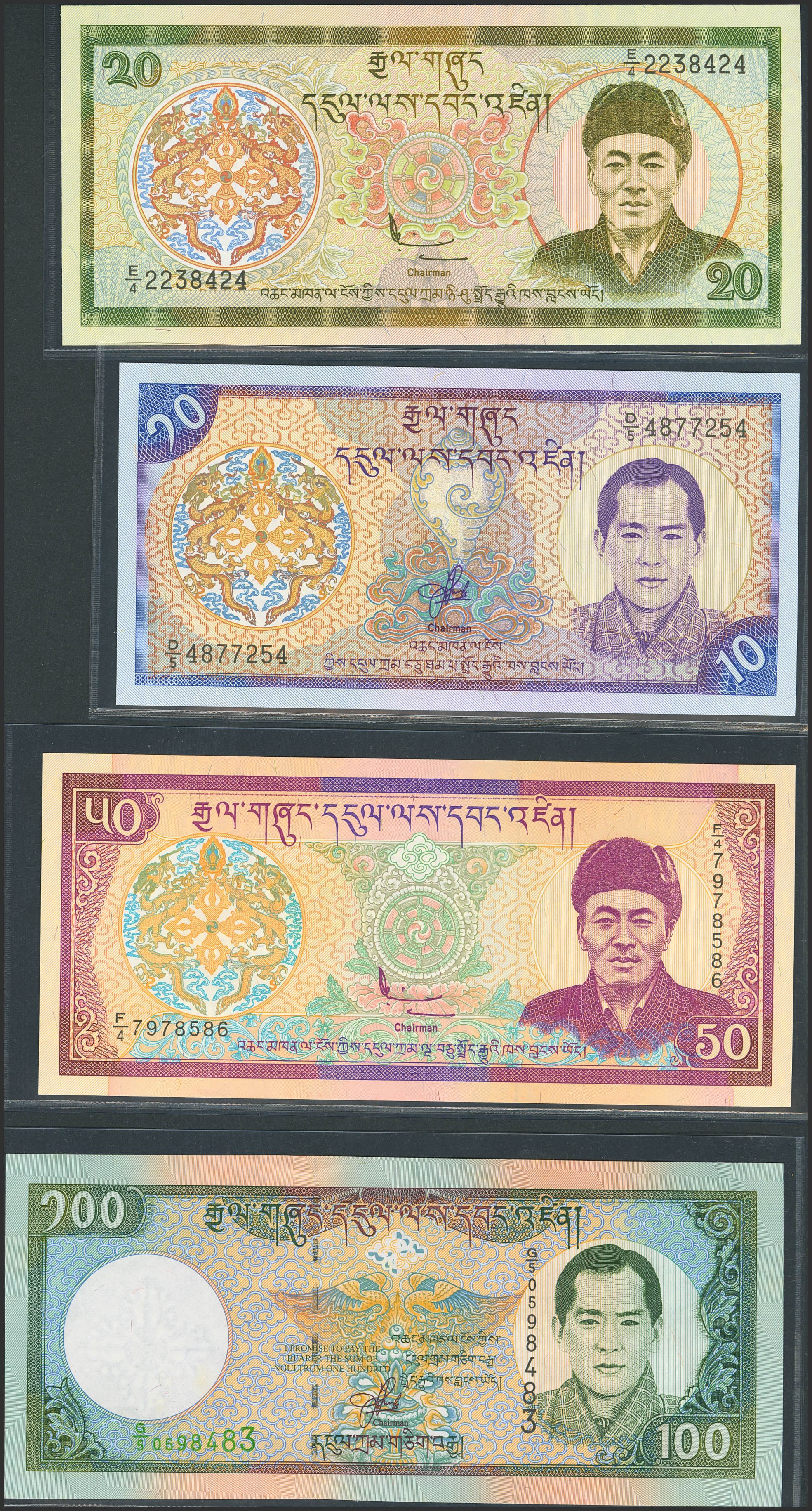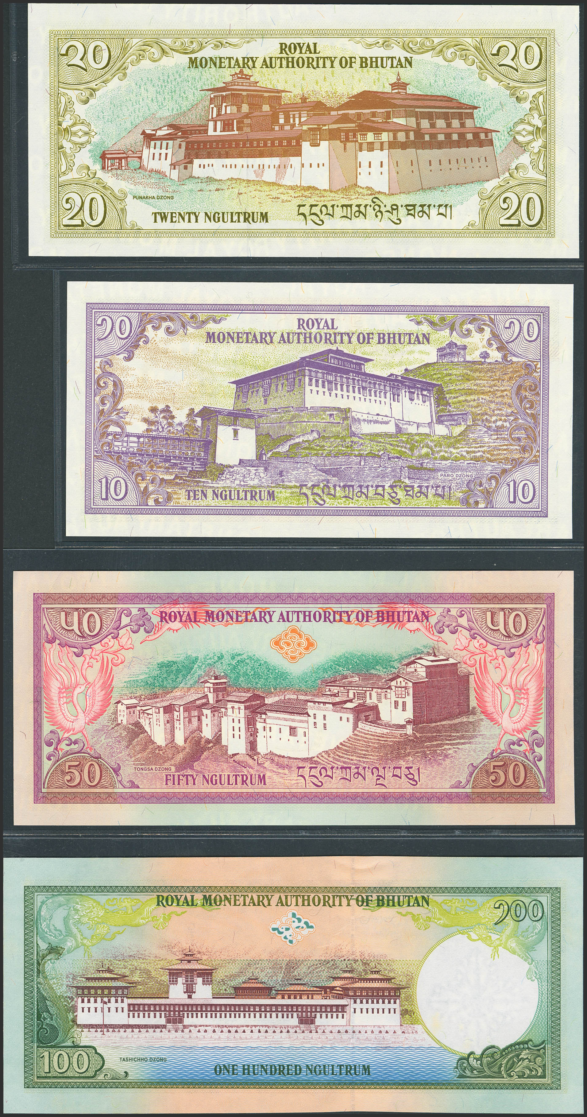BHUTAN. Lot of 4 notes from 20 to 100 Ngultrum. (2000ca). Royal Monetary Authority. (Pick: 22, 23, 24, 25). Uncirculated (1) and Less than Uncirculated (3).