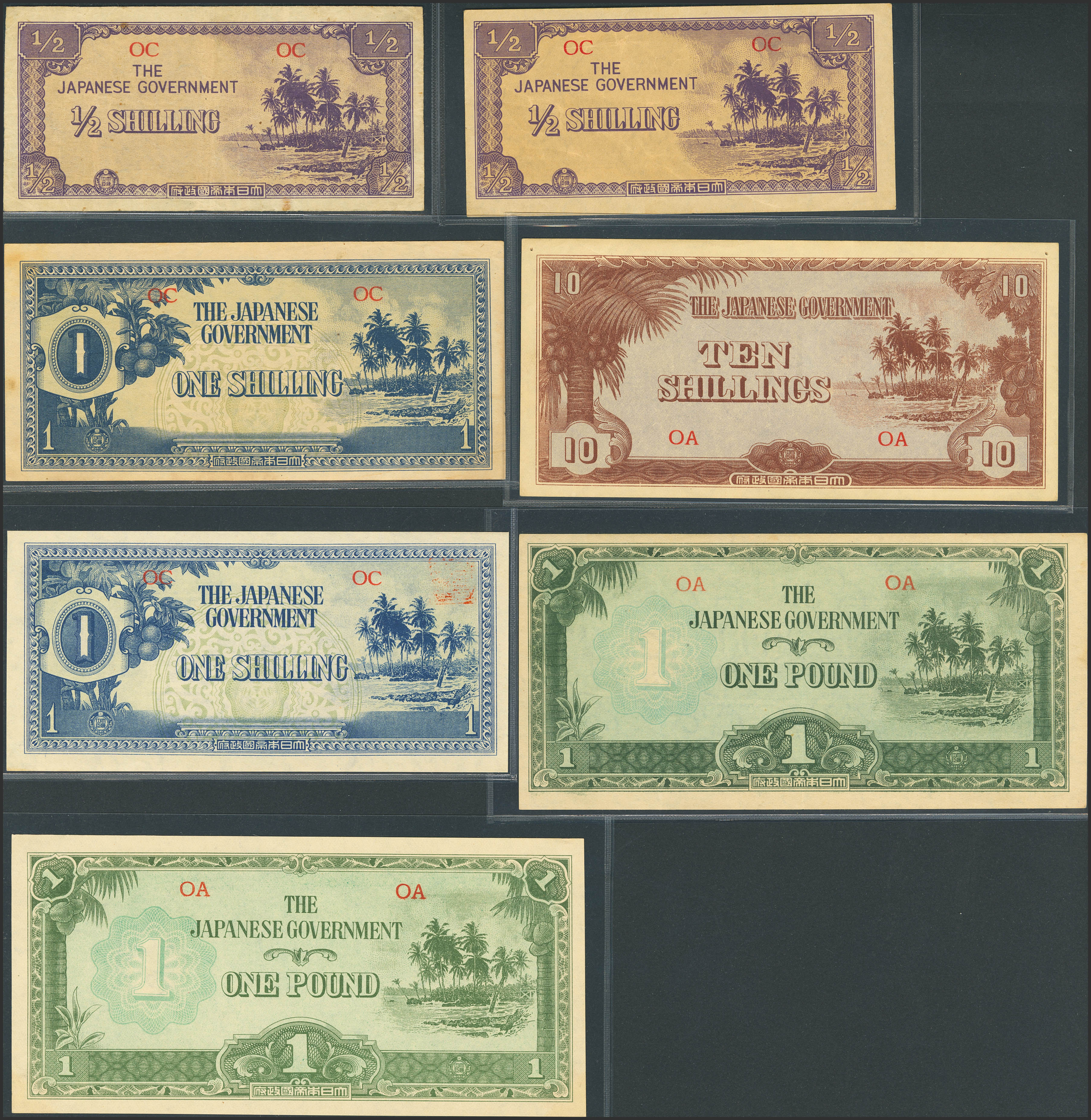 JAPANESE OCCUPATION-OCEANIA. Lot of 7 notes of all denominations of the series. From ½ Shilling to 1 Pound. (1942ca). Japanese Government. (Pick: 1a, 1b, 2, 3, 4). Very Fine to Uncirculated