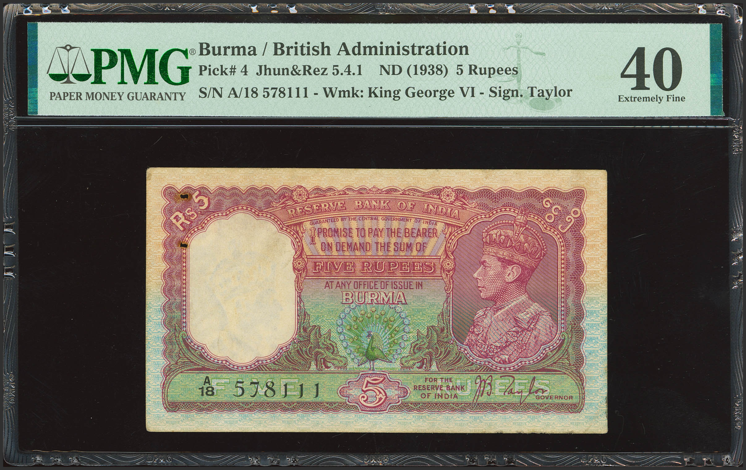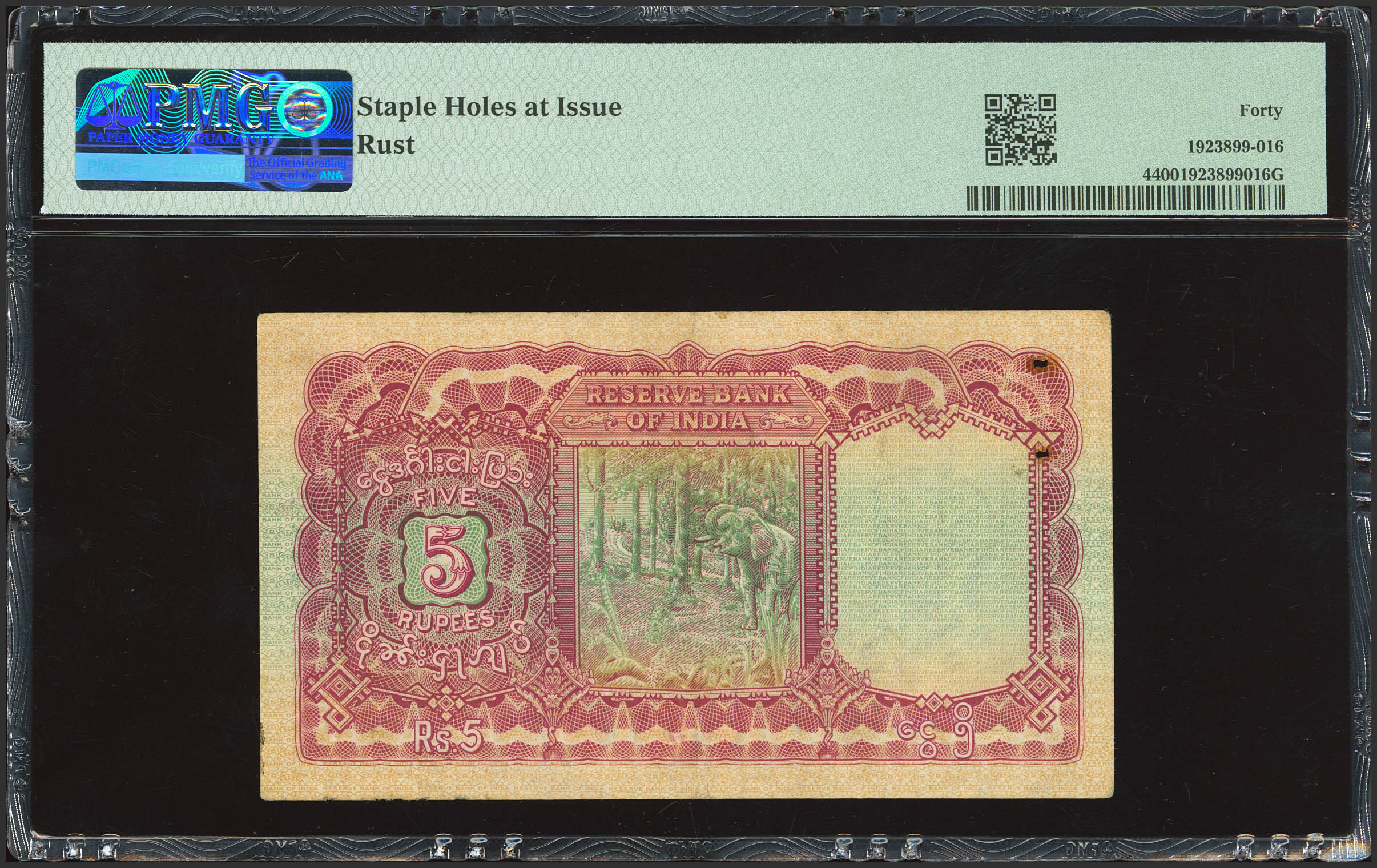 BURMA. 5 Rupees. (1938ca). Reserve Bank of India. (Pick: 4). PMG40 (staple holes at issue, rust).