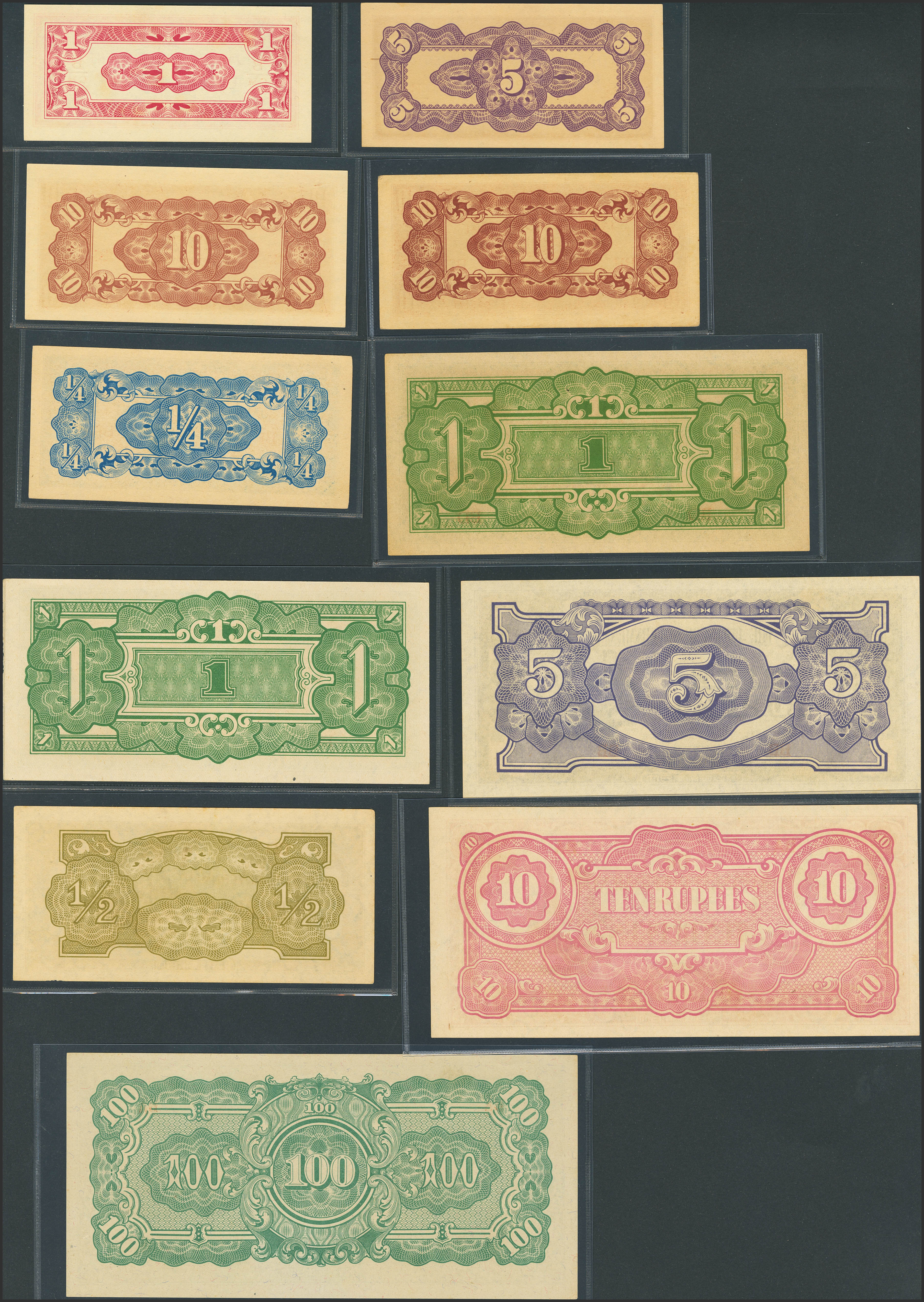 JAPANESE OCCUPATION-BURMA. Lot of 11 notes of all denominations of the series. From 1 Cent to 100 Rupees. (1942ca). Japanese Government. (Pick: 9b, 10b, 11a, 12a, 13b, 14a, 14b, 15b, 16b, 17b). Less than Uncirculated to Uncirculated.
