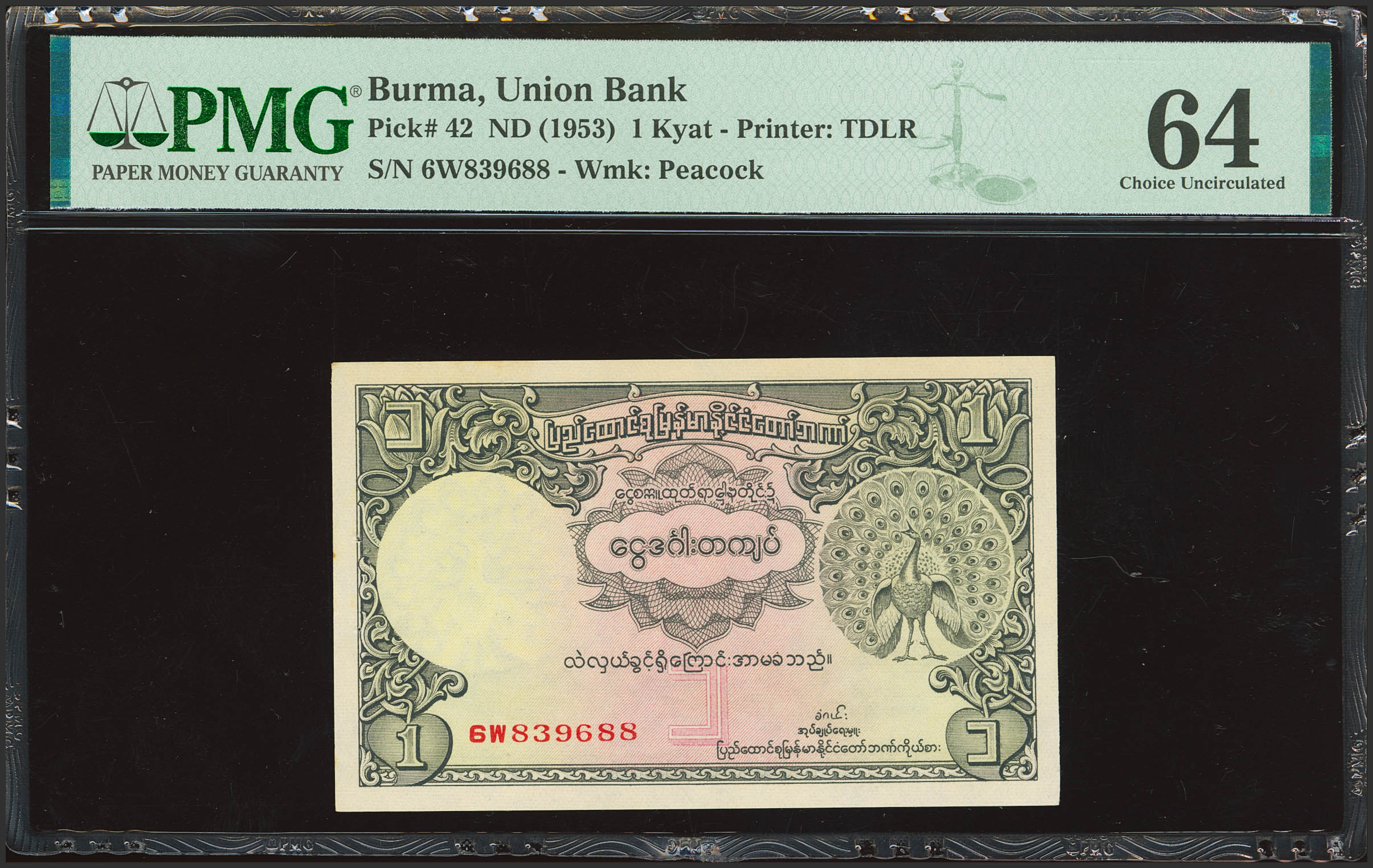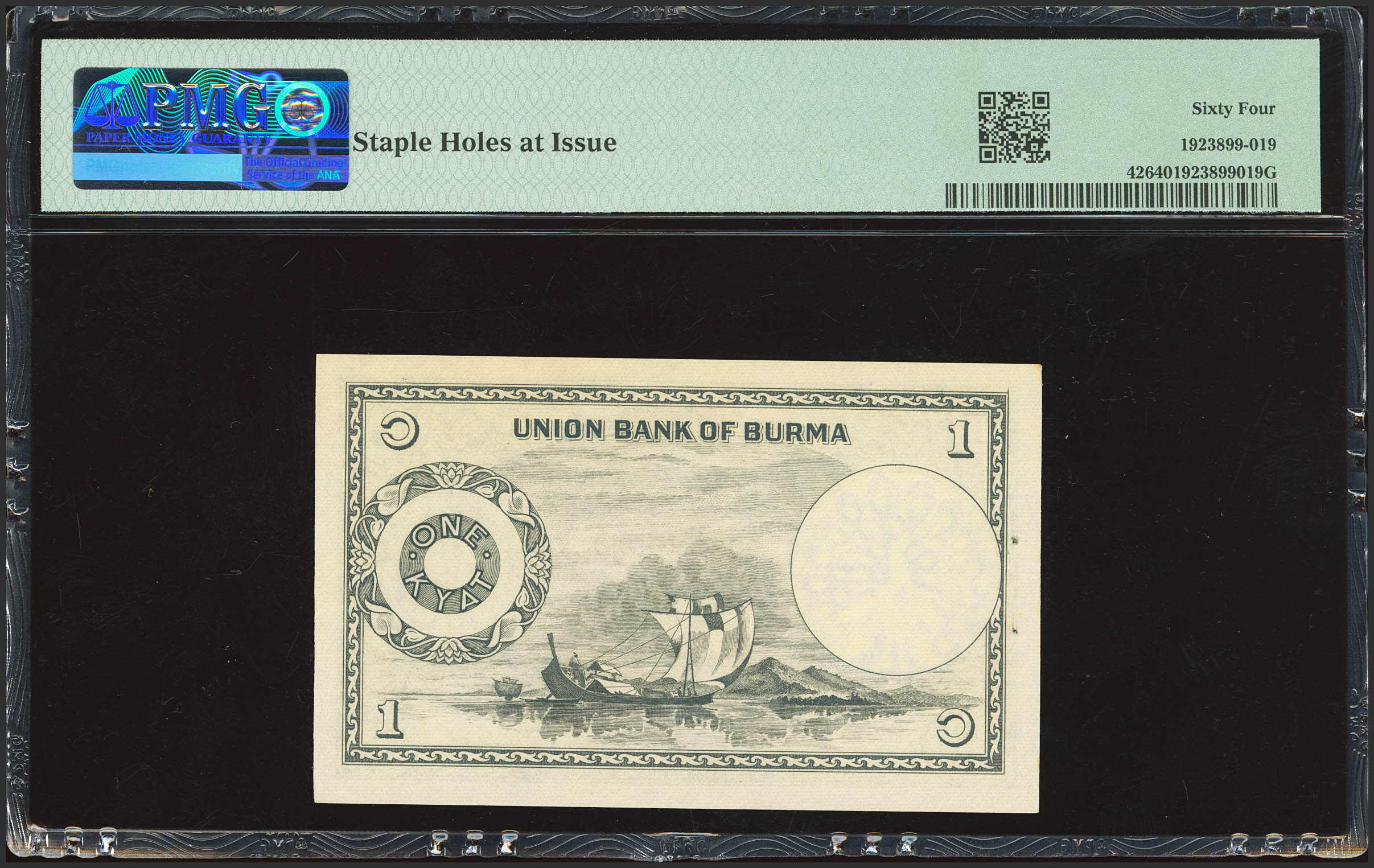 BURMA. 1 Kyat. (1953ca). Union Bank. (Pick: 42). PMG64 (staple holes at issue).