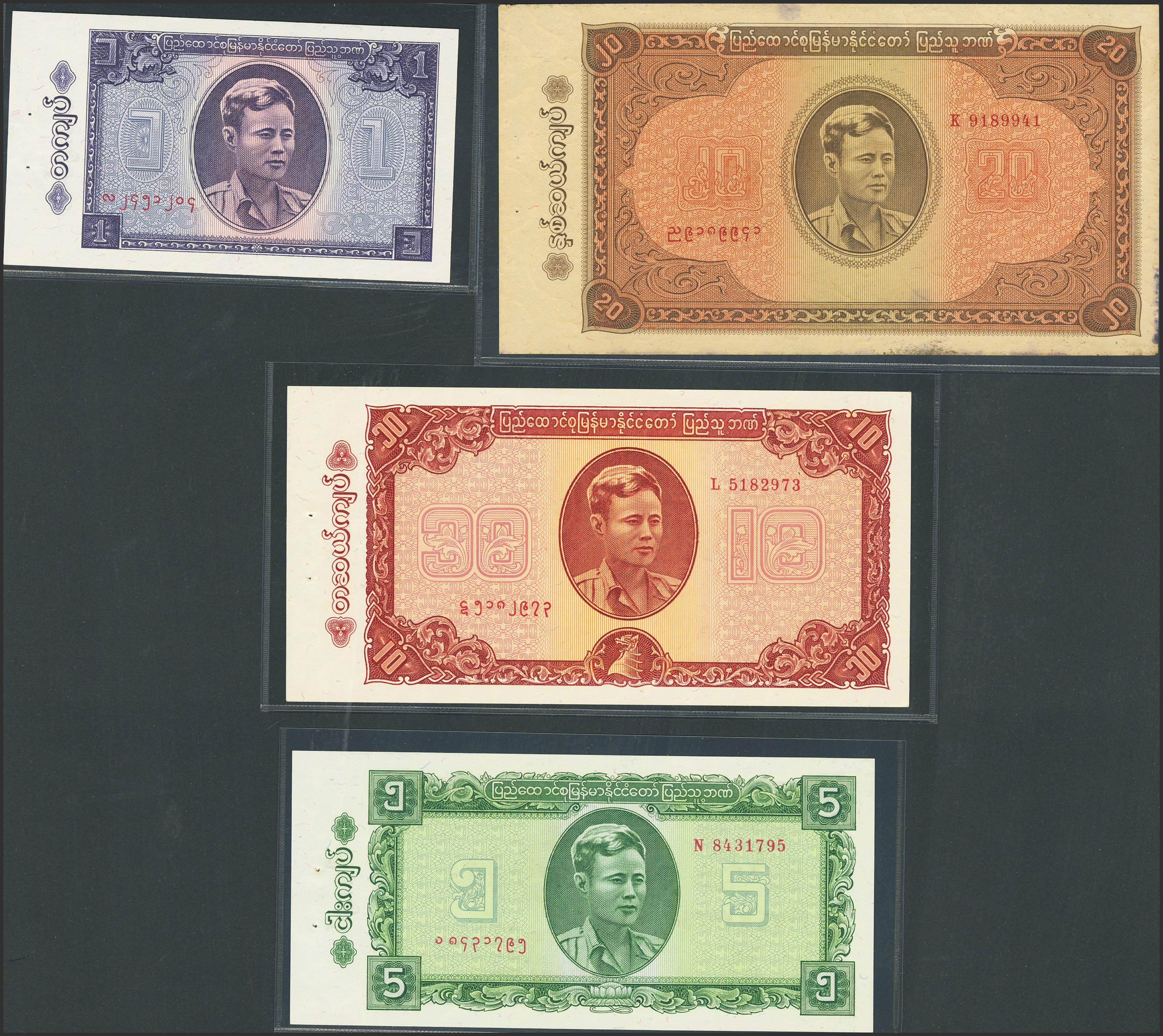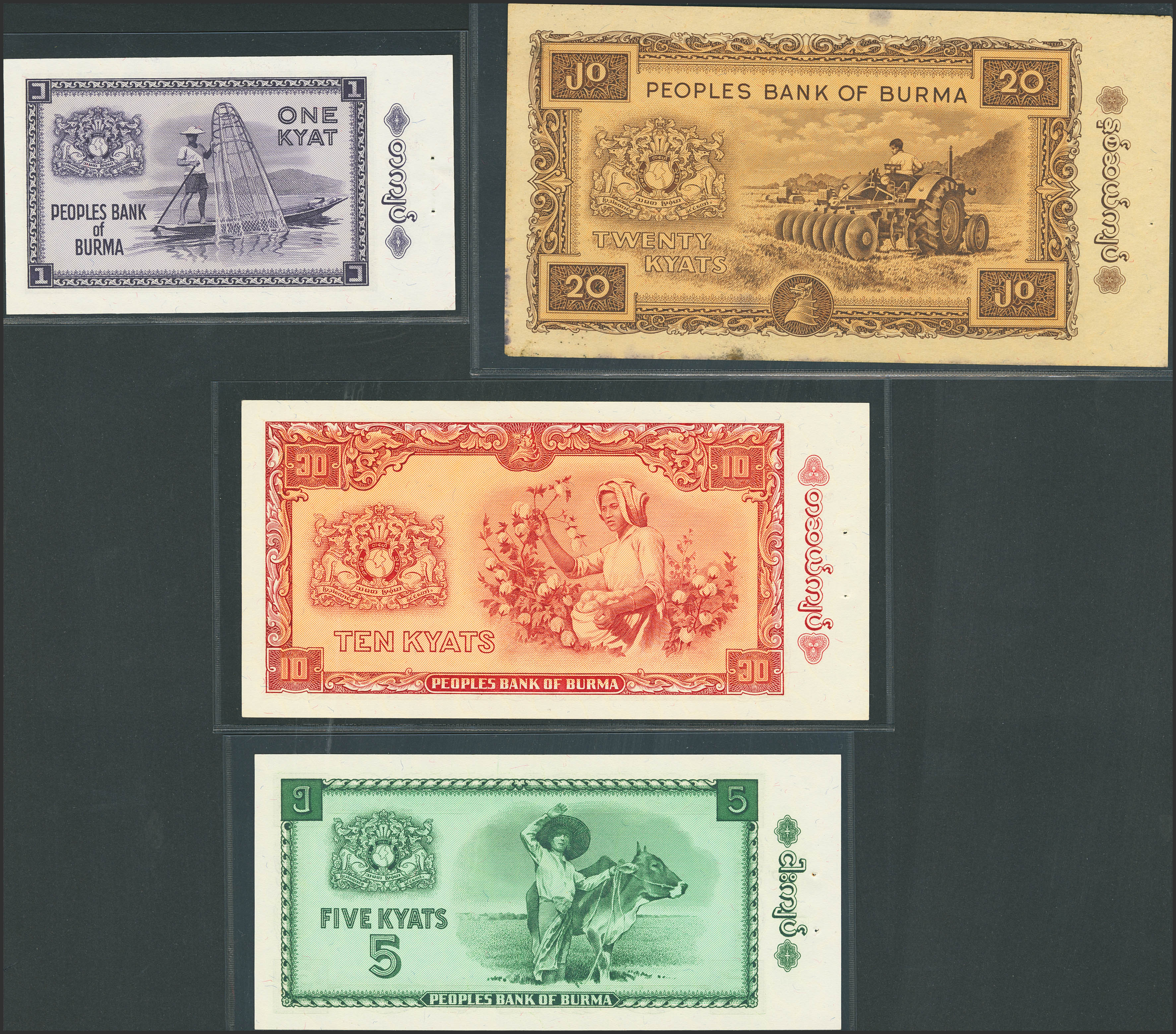 BURMA. Lot of 4 notes from 1 Kyat at 20 Kyats. (1965ca). Peoples Bank. (Pick: 52, 53, 54, 55). Uncirculated (3) and More than Extremely fine (1), staple holes at issue.