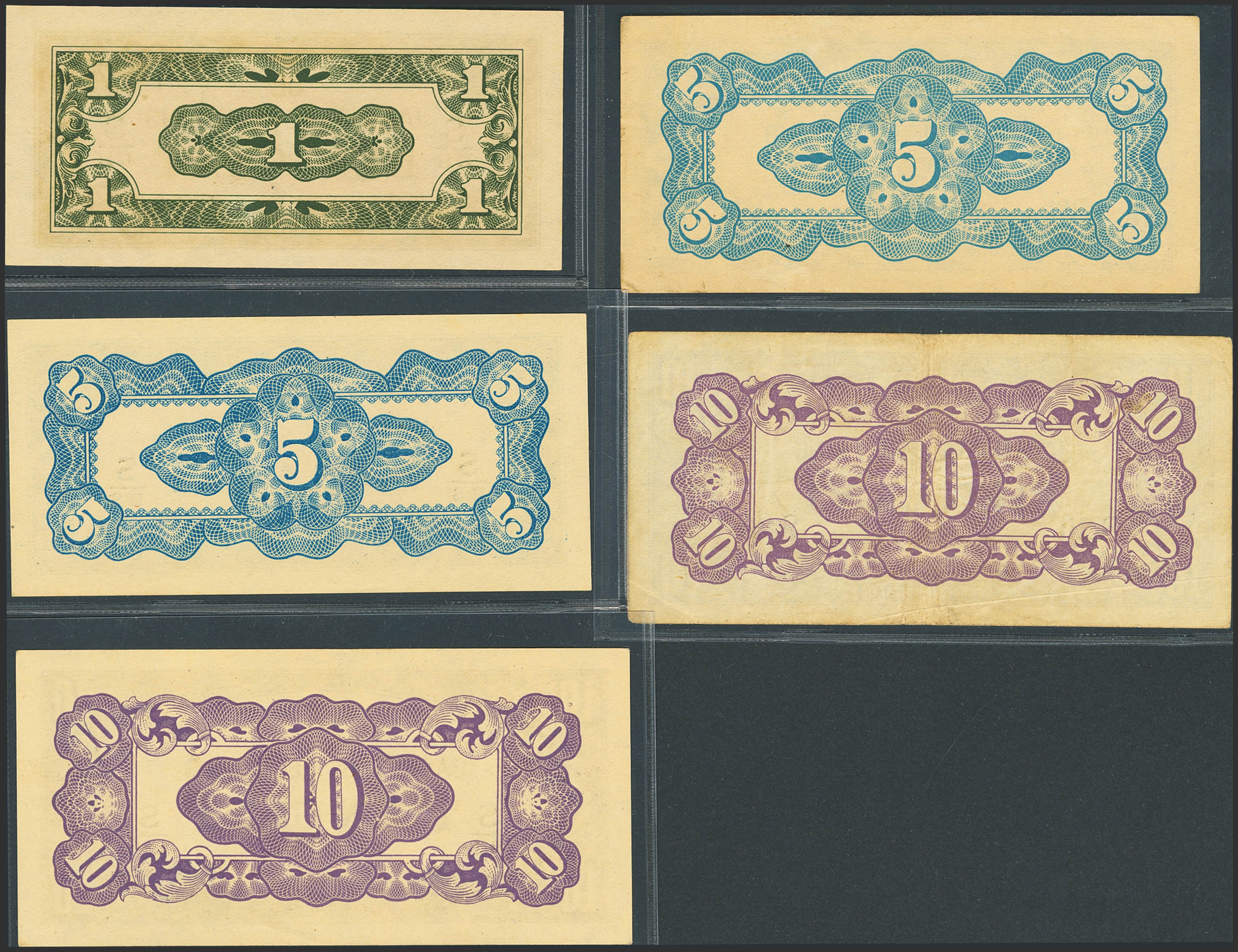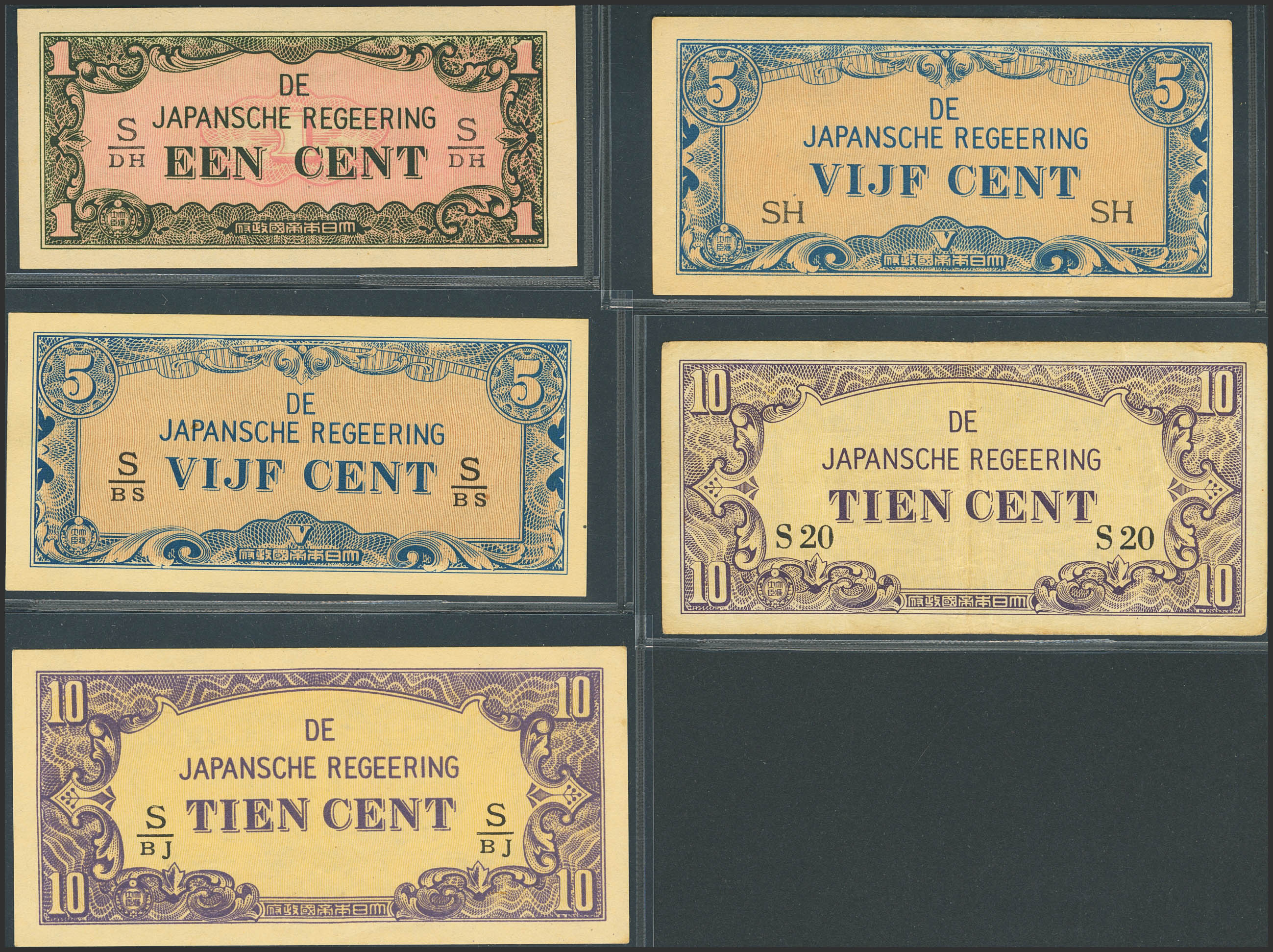 JAPANESE OCCUPATION-NETHERLANDS INDIES. Lot of 5 notes of 1, 5 and 10 Cent. (1942ca). De Japansche Regeering. (Pick: 119b, 120b, 120c, 121a, 121c). Uncirculated to About Uncirculated, except pick 121a is Very Fine.
