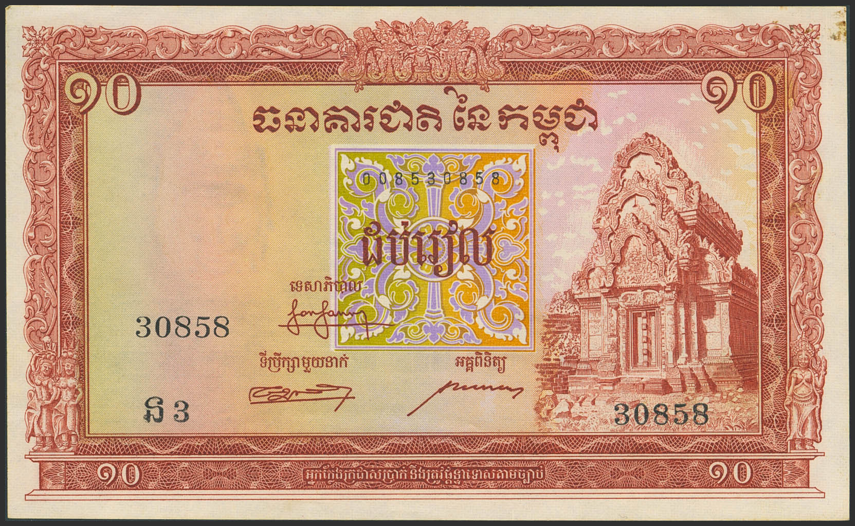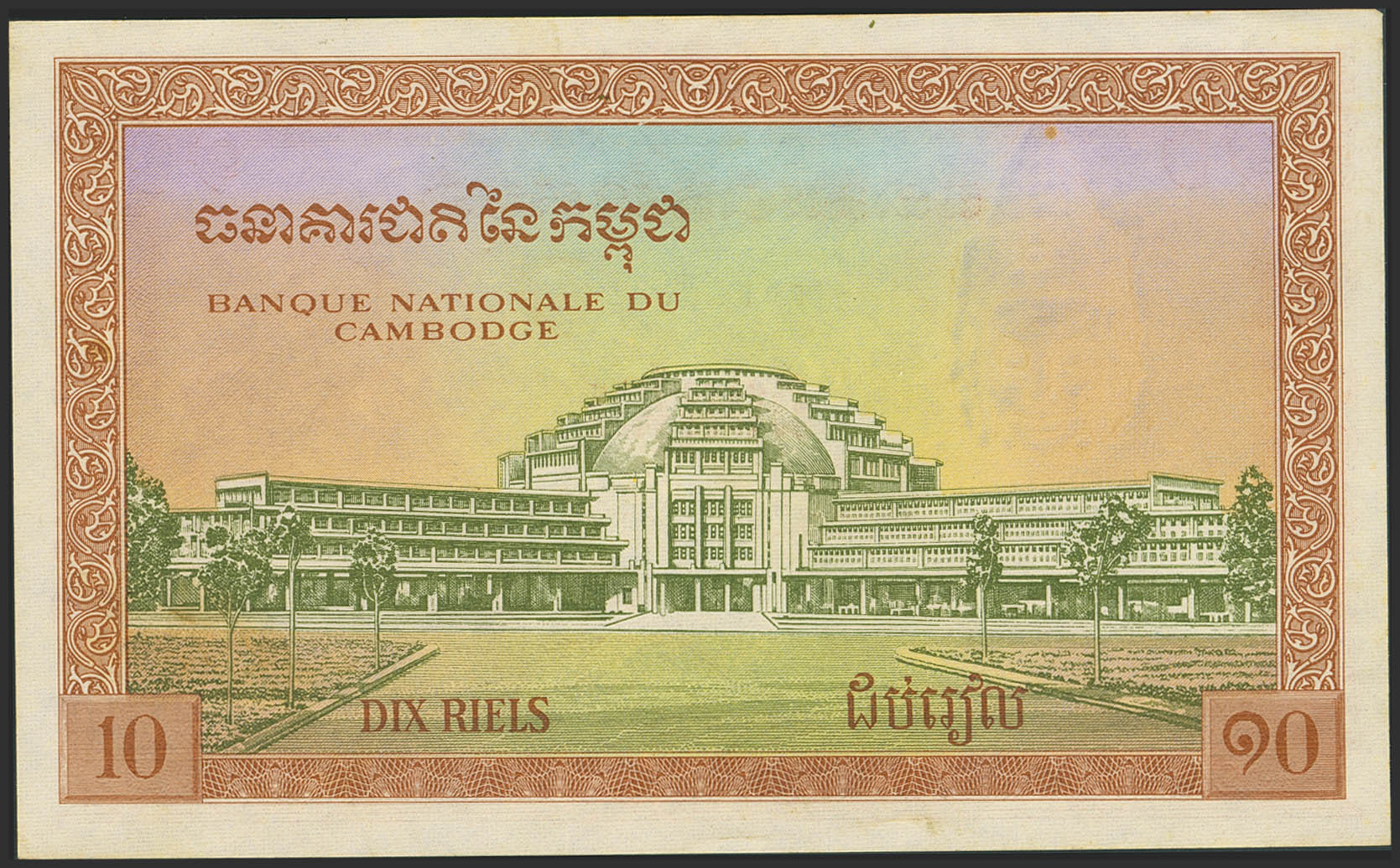 CAMBODIA. 10 Riels. (1955ca). Banque Nationale. (Pick: 3a). About Uncirculated, staple holes, stained corner.
