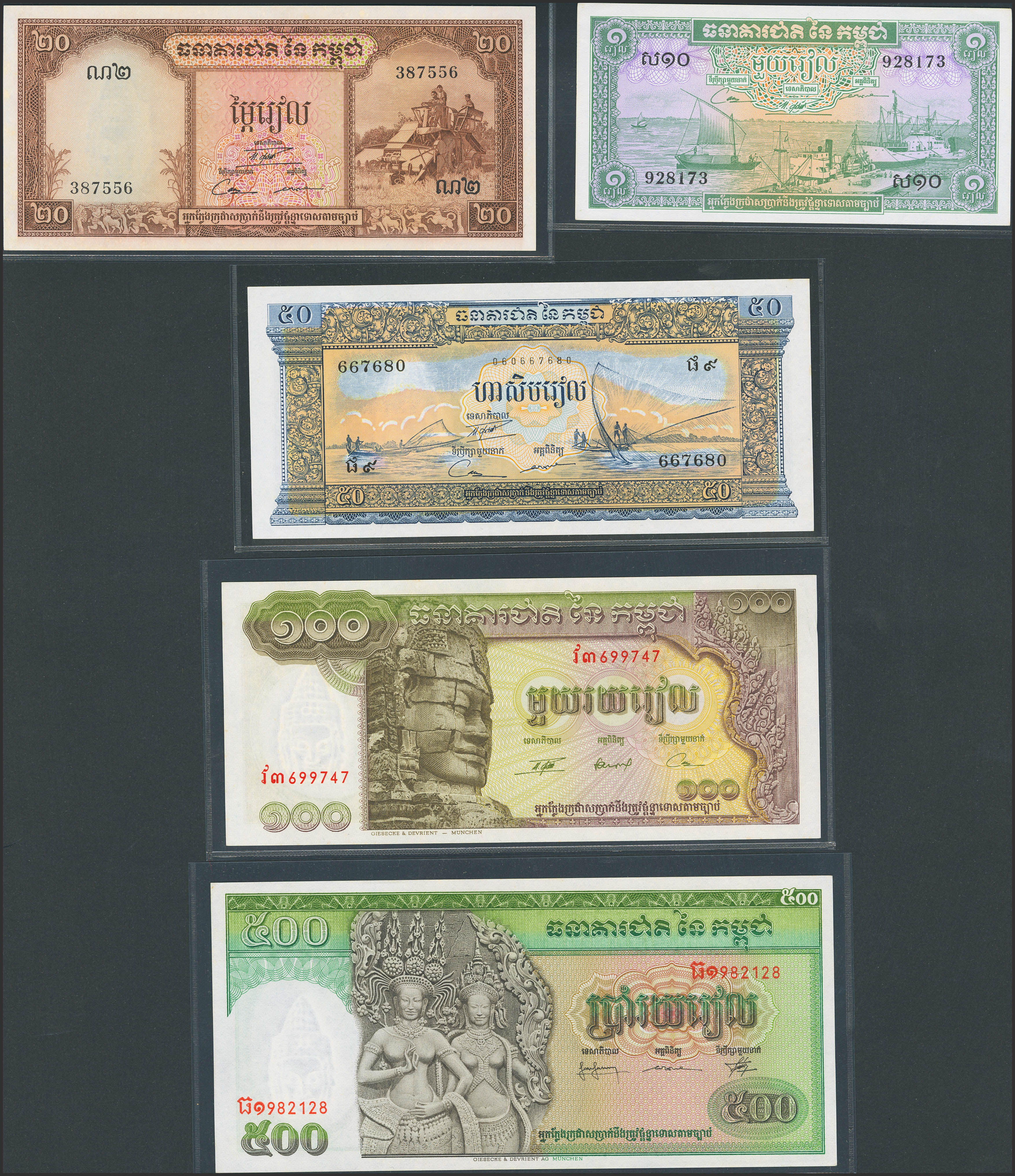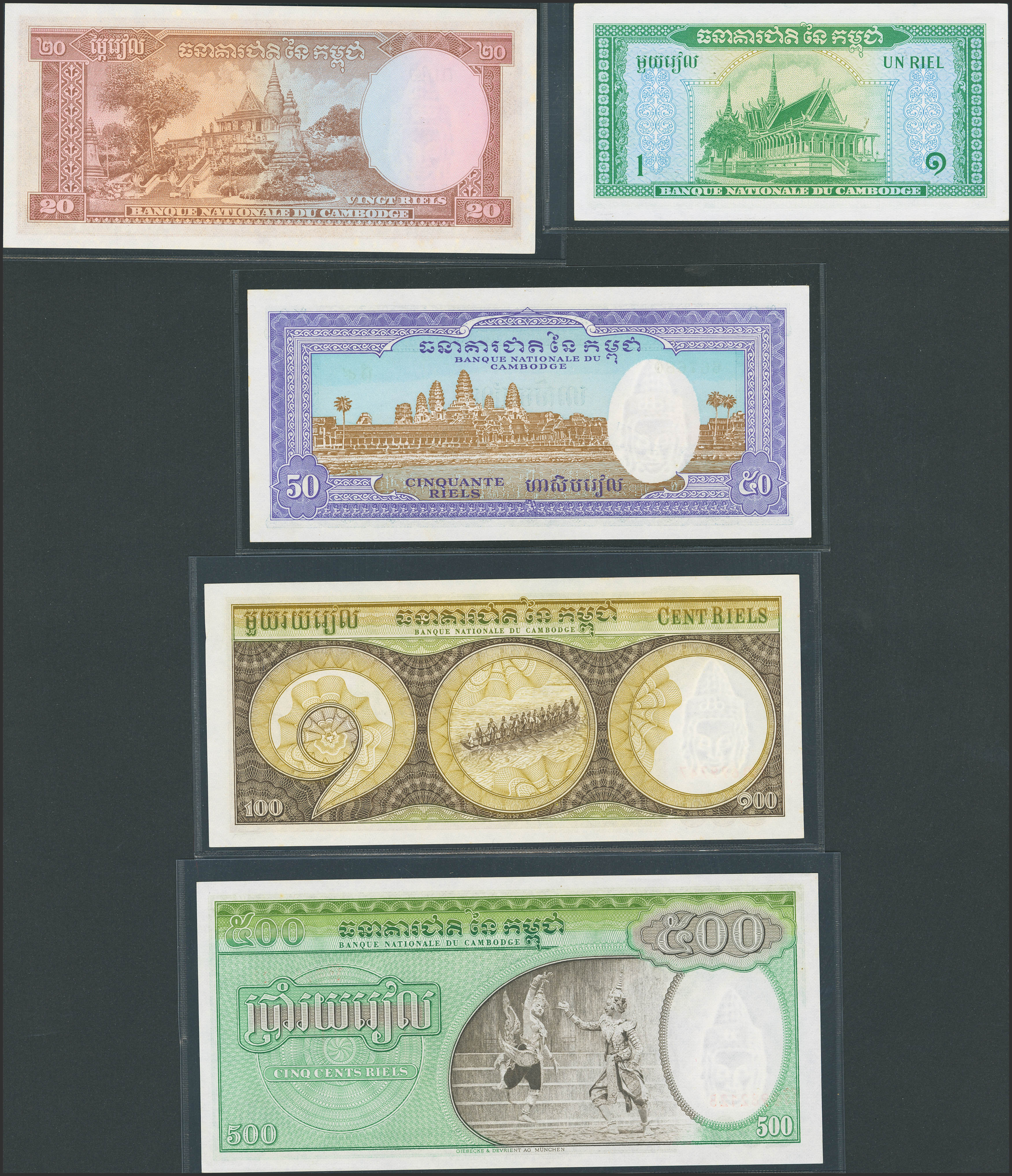 CAMBODIA. Complete set from 1 Riel at 500 Riels. (1956ca). Banque Nationale. (Pick: 4c, 5d, 7d, 8c, 9c). Less than Uncirculated / Uncirculated.