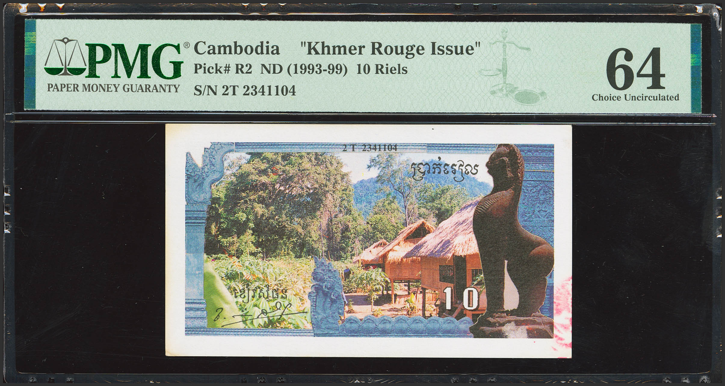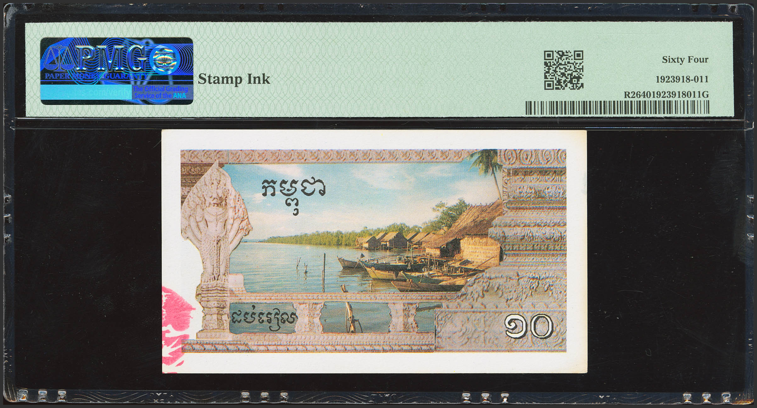 CAMBODIA. 10 Riels. (1993ca). Khmer Rouge. Issued for circulation in Khmer Rouge occupied areas in exchange for Thailand Baht. (Pick: R2). PMG64 (ink stamp).