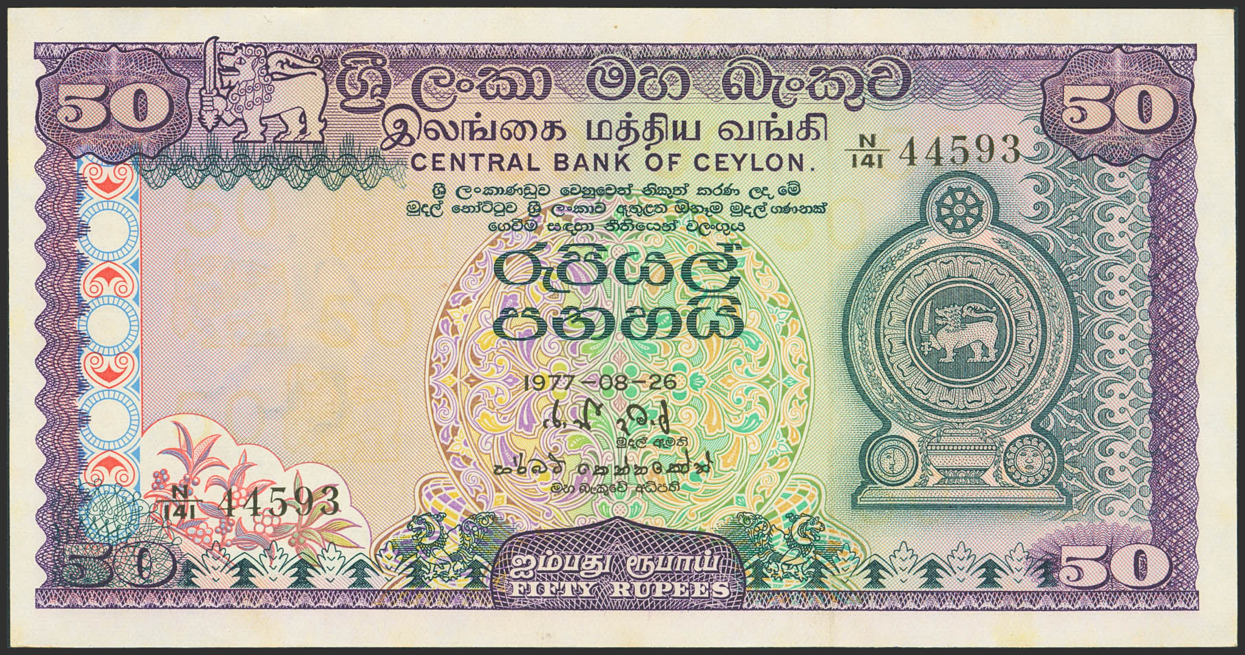 CEYLON. 50 Rupees. 26 August 1977. Central Bank. (Pick: 81). About Uncirculated.