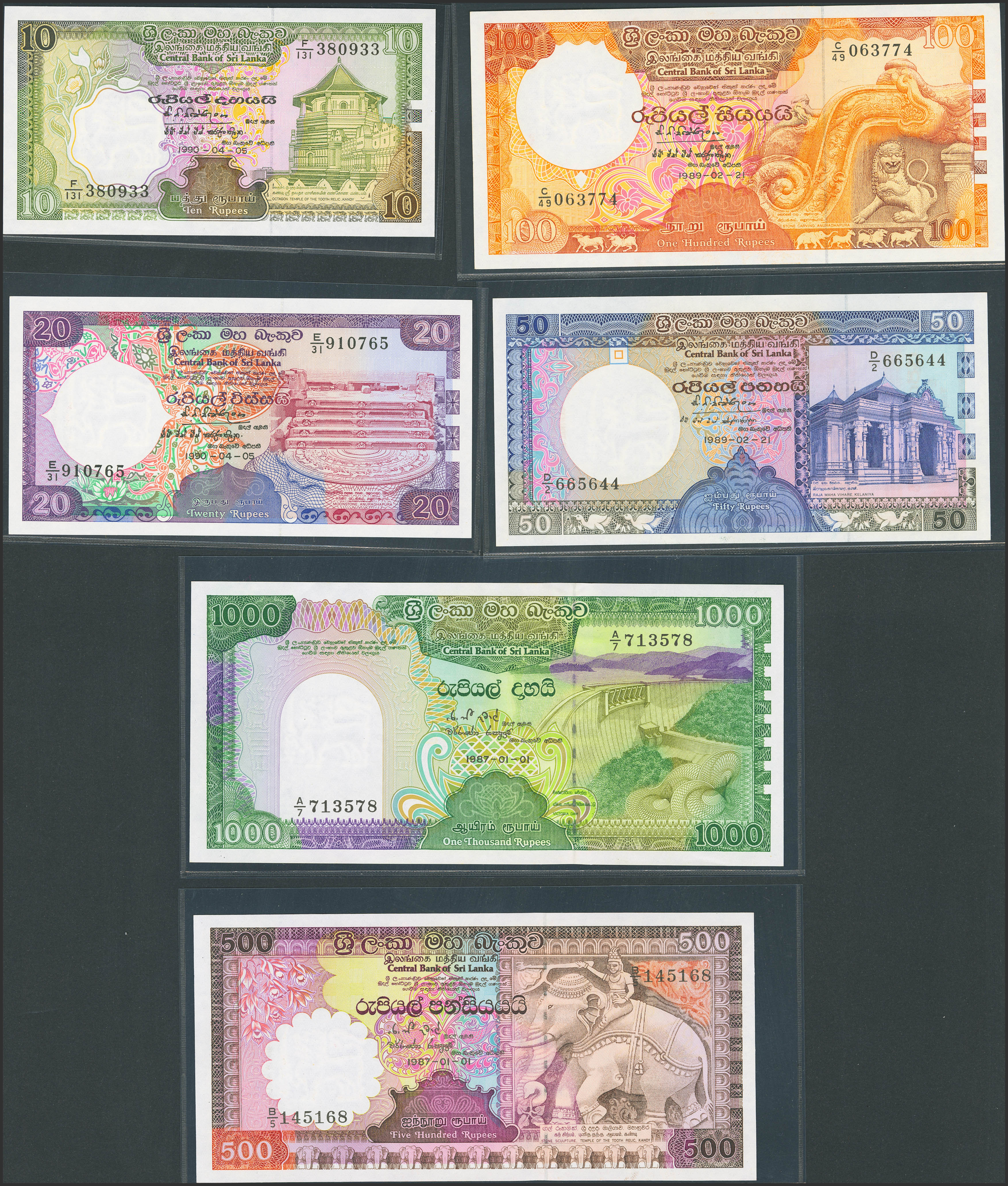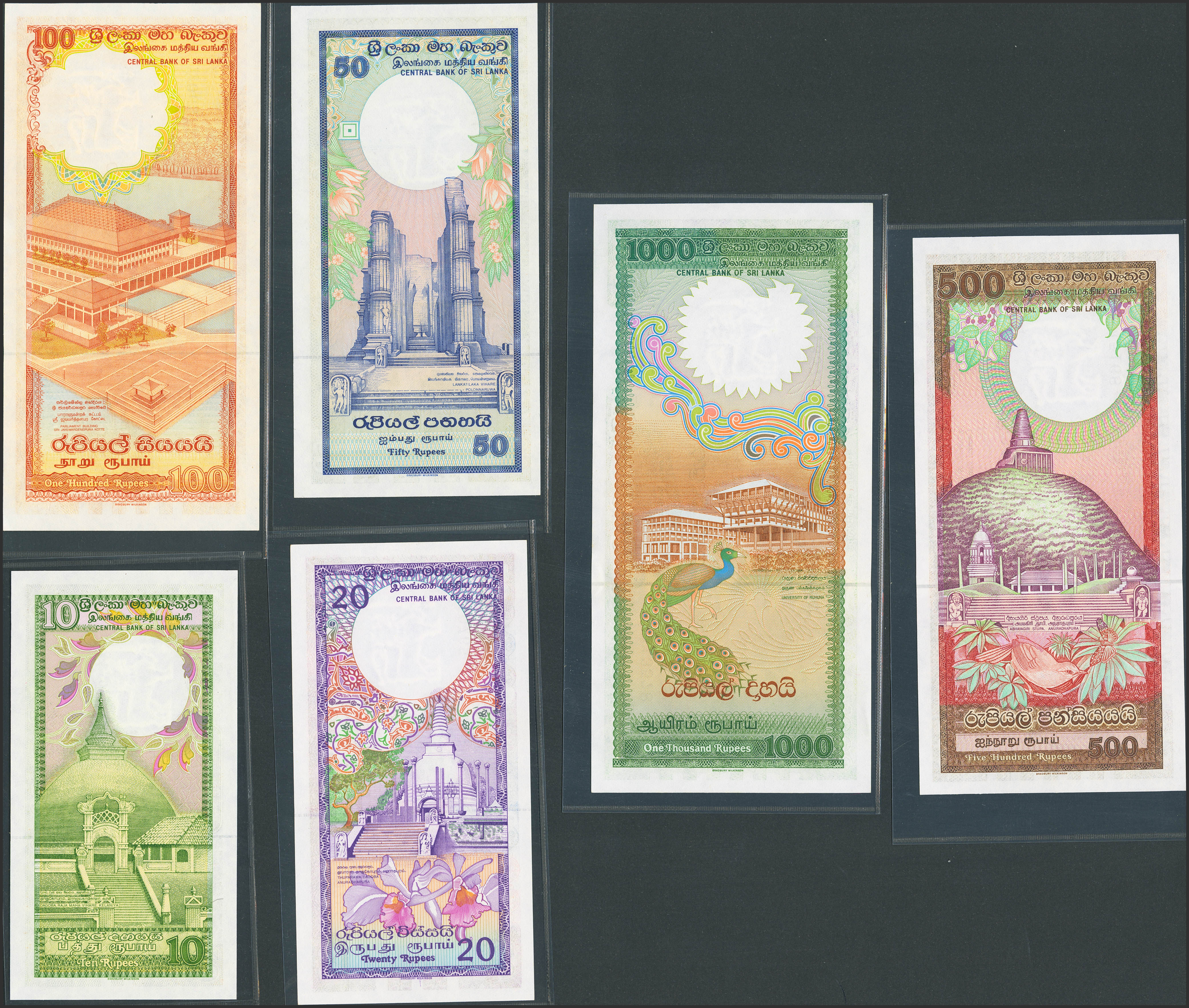 SRI LANKA. Complete set from 10 at 1000 Rupees. (1987ca). Central Bank. (Pick: 96e, 97c, 98b, 99c, 100a, 101a). All uncirculated except for the 1000 rupees note, which is about uncirculated.