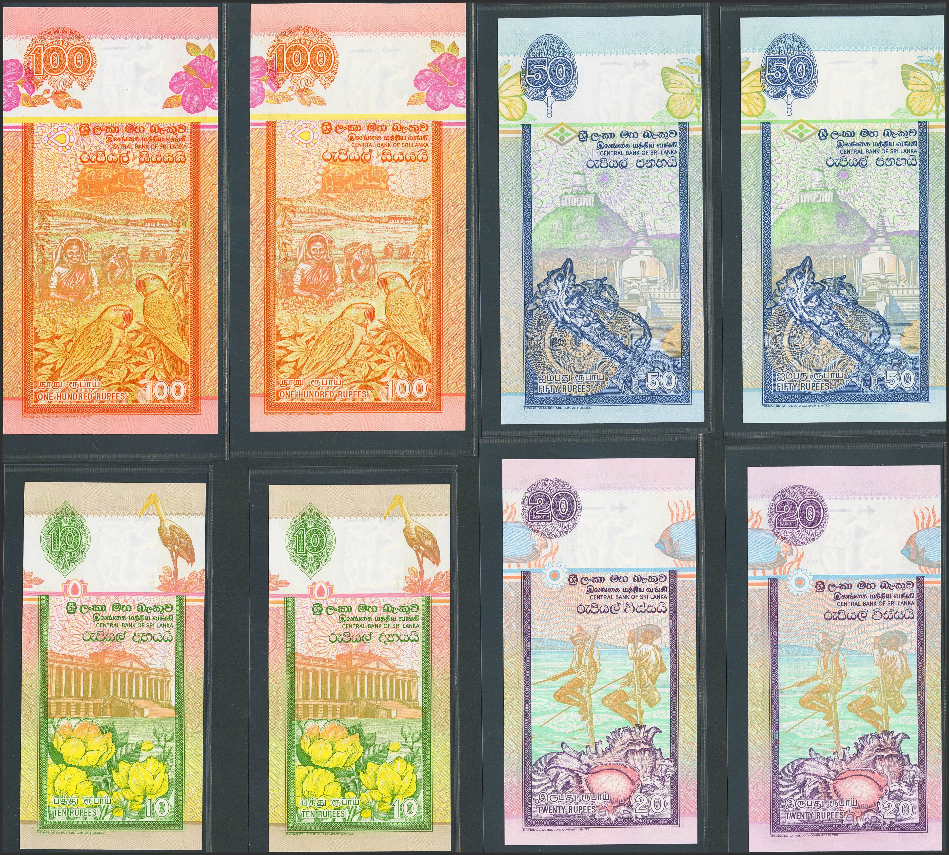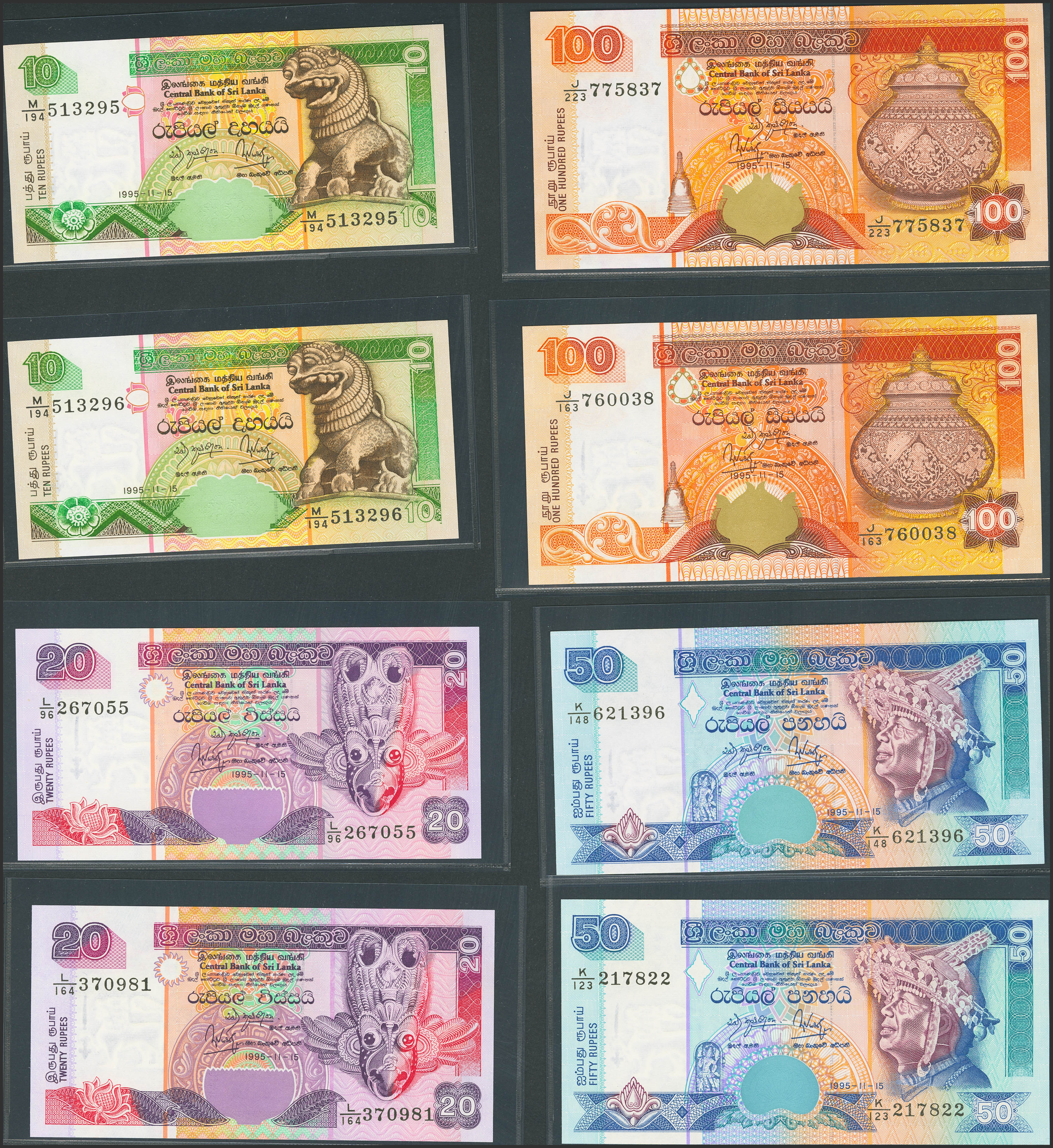 SRI LANKA. Lot of 8 notes from 10 at 100 Rupees. 15 November 1995. Central Bank. (Pick: 108a(2), 109a(2), 110a(2), 111a(2)). Uncirculated.