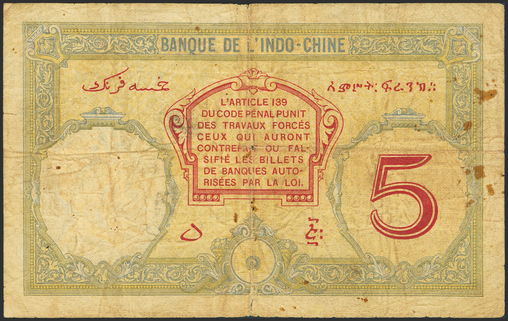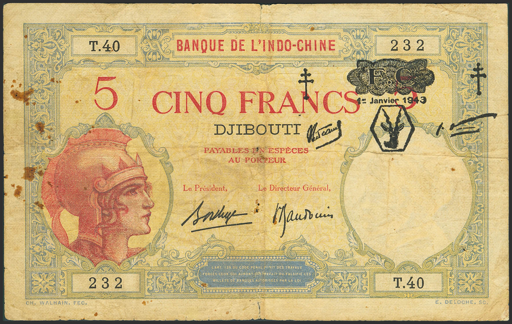 DJIBOUTI-FRENCH SOMALILAND. 5 Francs. 1 January 1943. Banque de L´Indochine. Overprint Crosses of Lorraine. Head of antelope and F.C. (Pick: 11). Fine, pinholes, rust, tears.