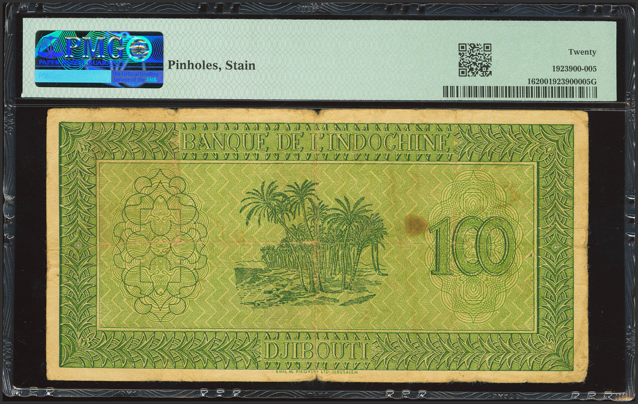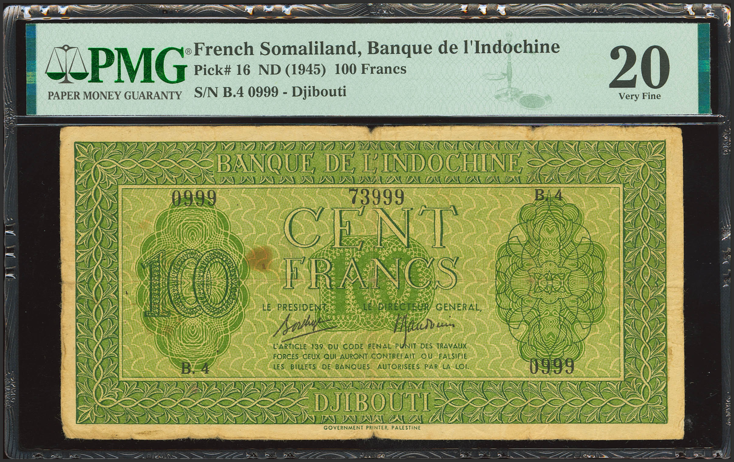 DJIBOUTI-FRENCH SOMALILAND. 100 Francs. (1945ca). Banque de L´Indochine. (Pick: 16). PMG20 (pinholes, stains).