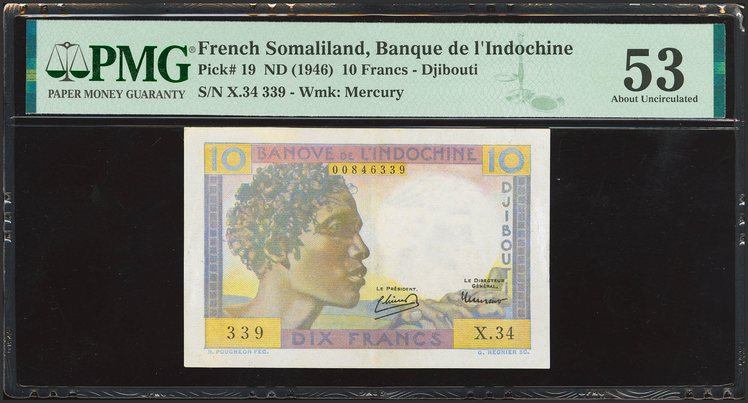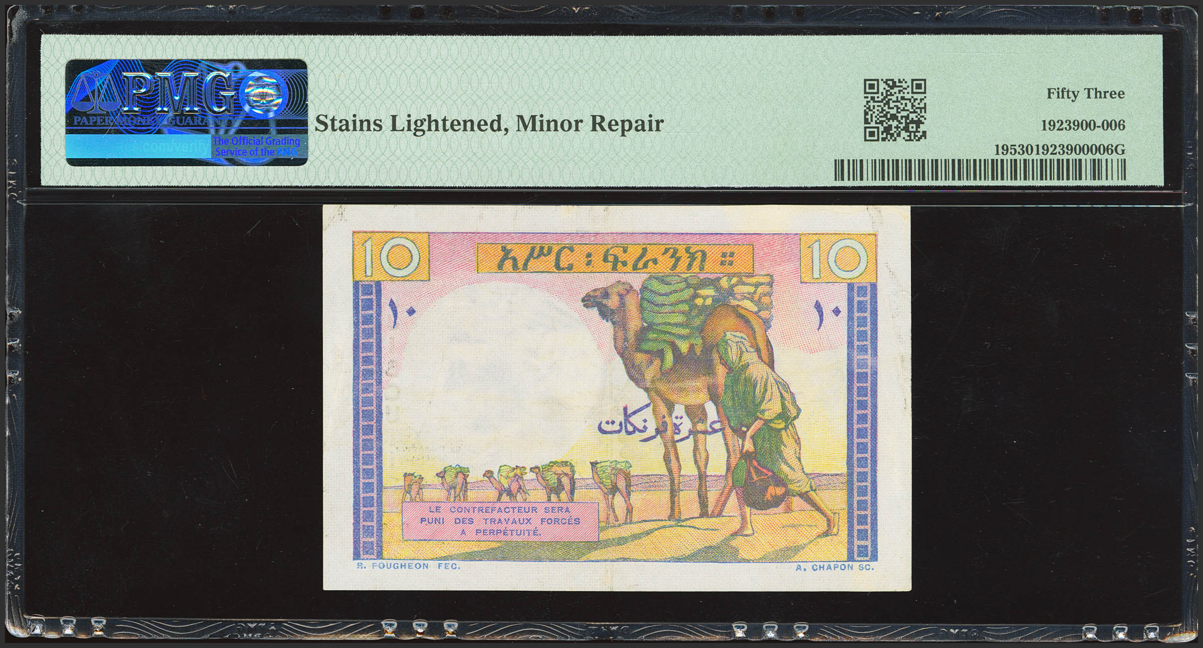 DJIBOUTI-FRENCH SOMALILAND. 10 Francs. (1946ca). Banque de L´Indochine. (Pick: 19). PMG53 (stains lightened, minor repair).