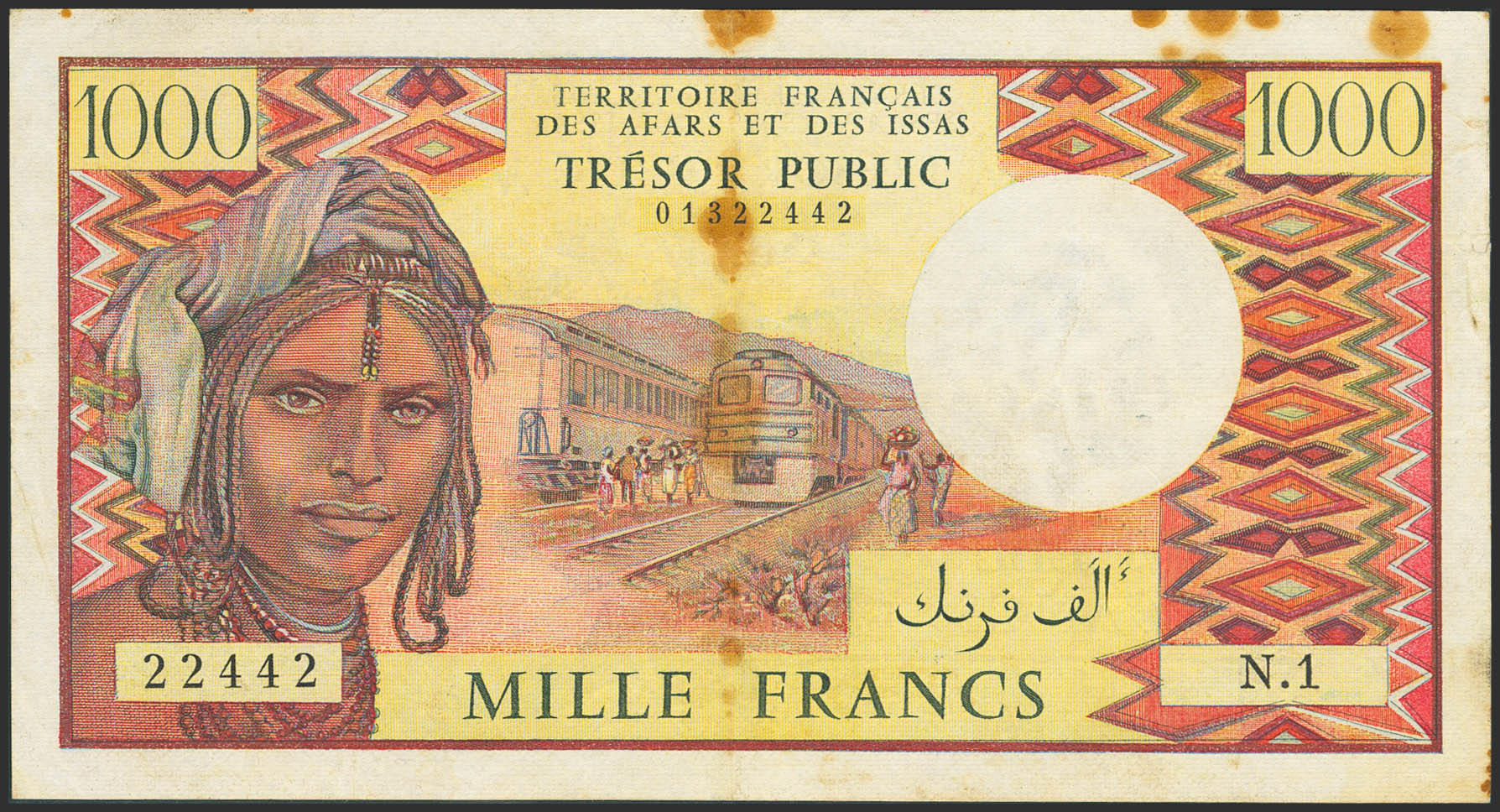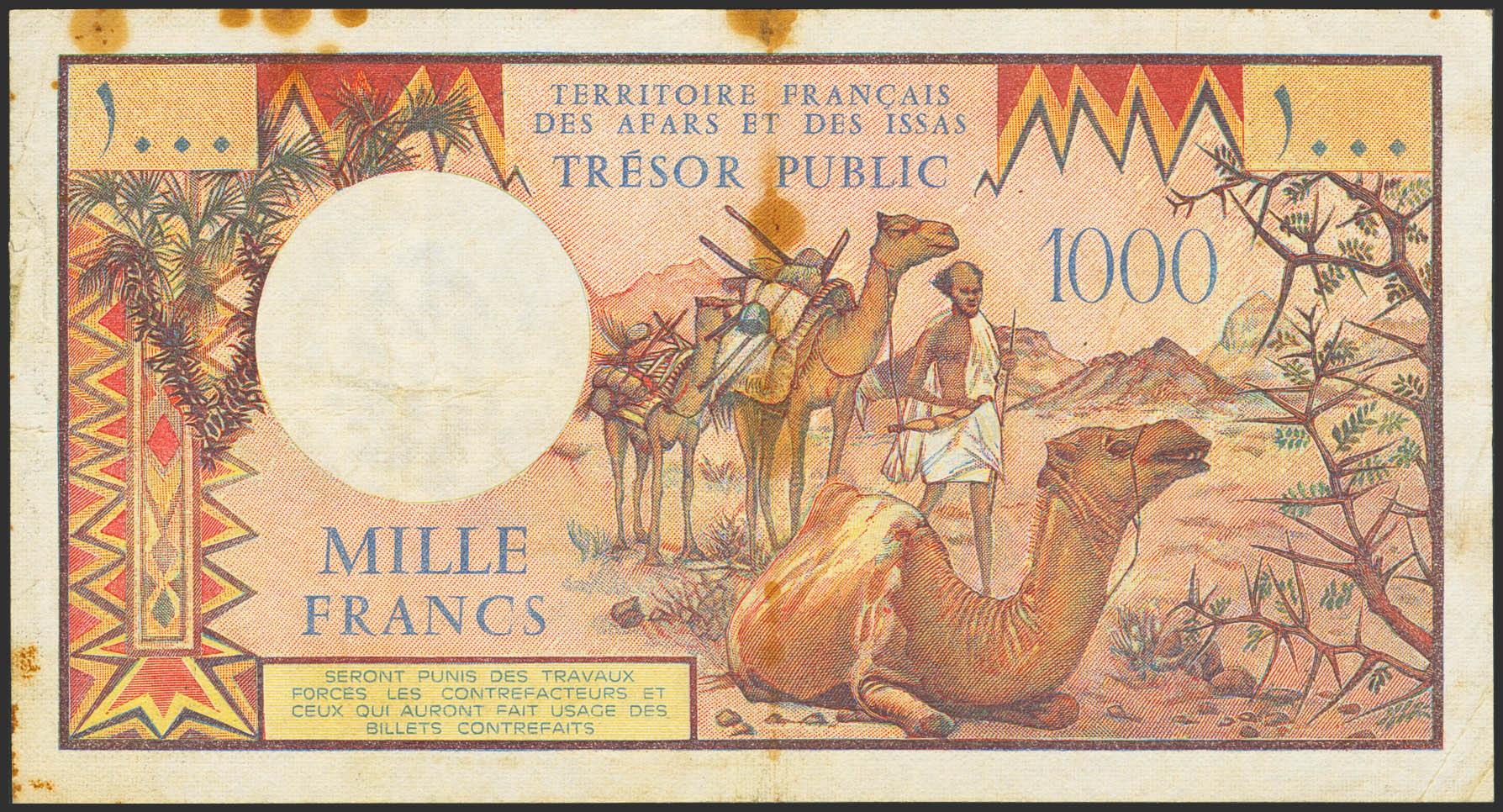 DJIBOUTI-FRENCH AFARS AND ISSAS TERRITORY. 1000 Francs. (1975ca). Trésor Public. Territoire Français des Afars et des Issas. (Pick: 34). Very Fine, rust stains.