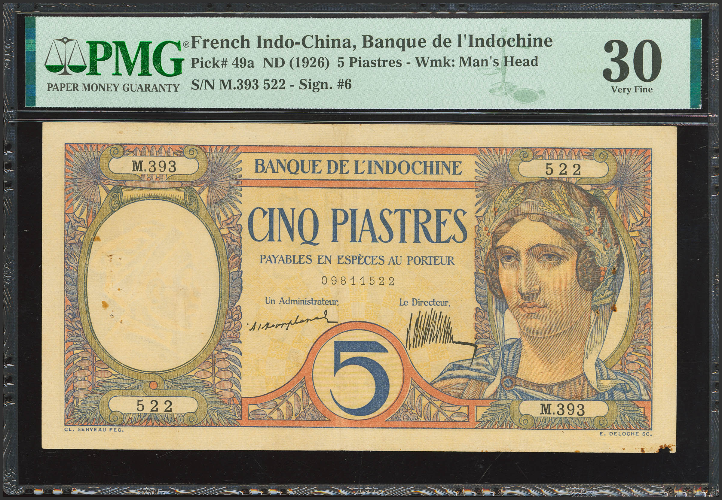 FRENCH INDOCHINA. 5 Piastres. (1926ca). Banque de L´Indochine. (Pick: 49a). PMG30 (rust damage, pinholes).