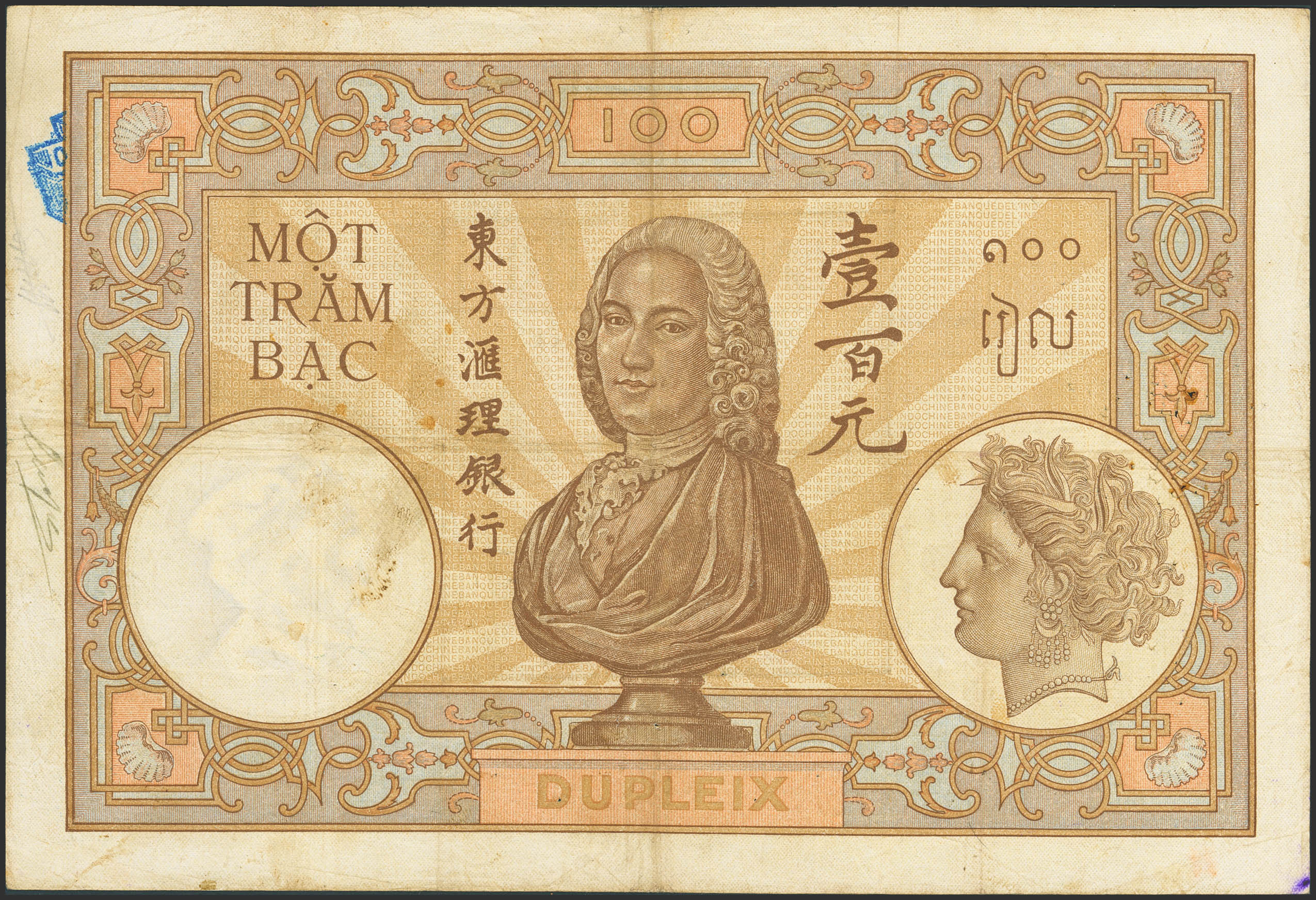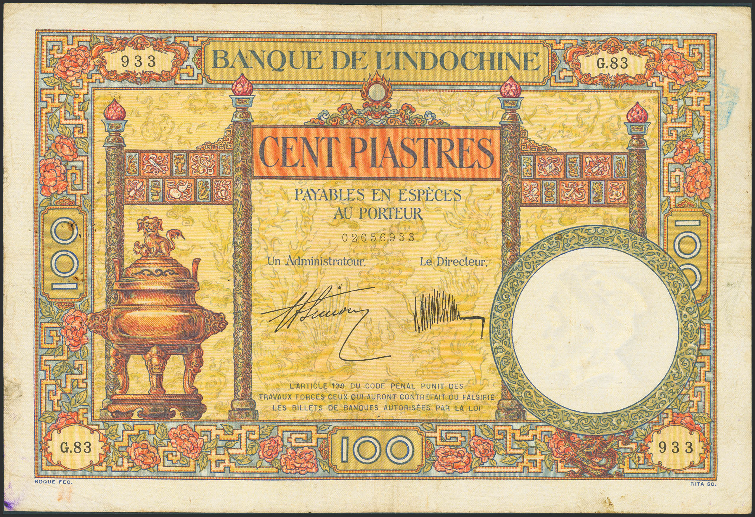 FRENCH INDOCHINA. 100 Piastres. (1925ca). Banque de L´Indochine. Simon and De la Chaume. (Pick: 51b). Very Fine, pinholes.