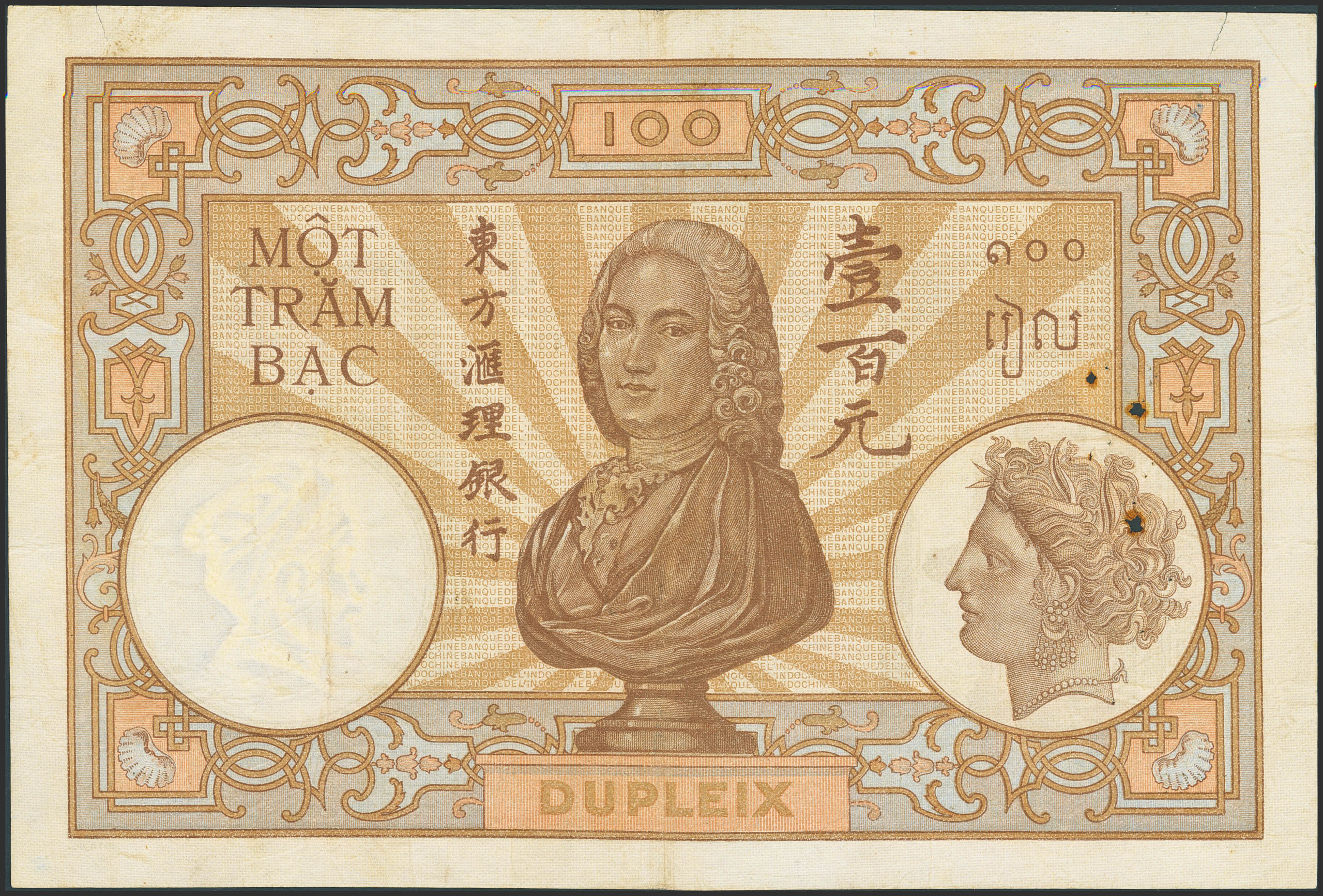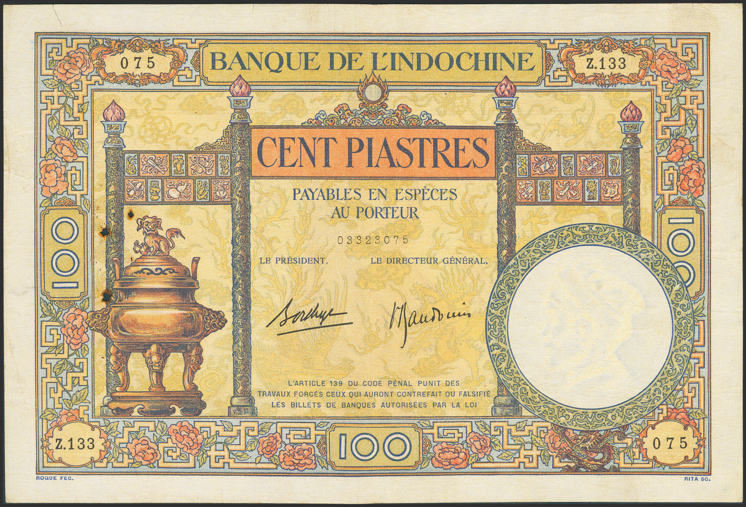 FRENCH INDOCHINA. 100 Piastres. (1925ca). Banque de L´Indochine. Borduge and Baudouin. (Pick: 51d). Very Fine, pinholes, spindle holes.