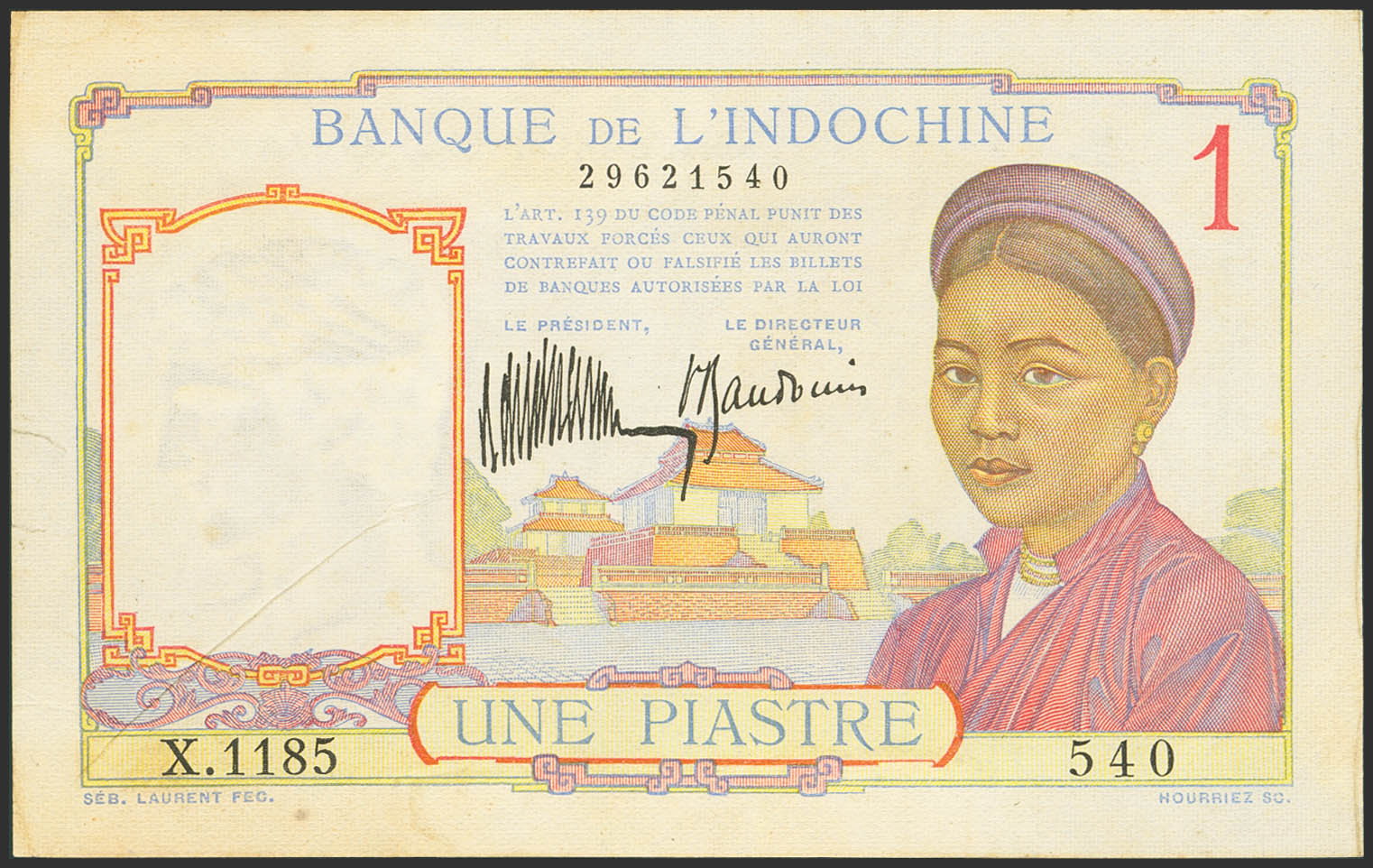 FRENCH INDOCHINA. 1 Piastre. (1932ca). Banque de L´Indochine. (Pick: 54a). Almost Uncirculated, two tears on the left edge.