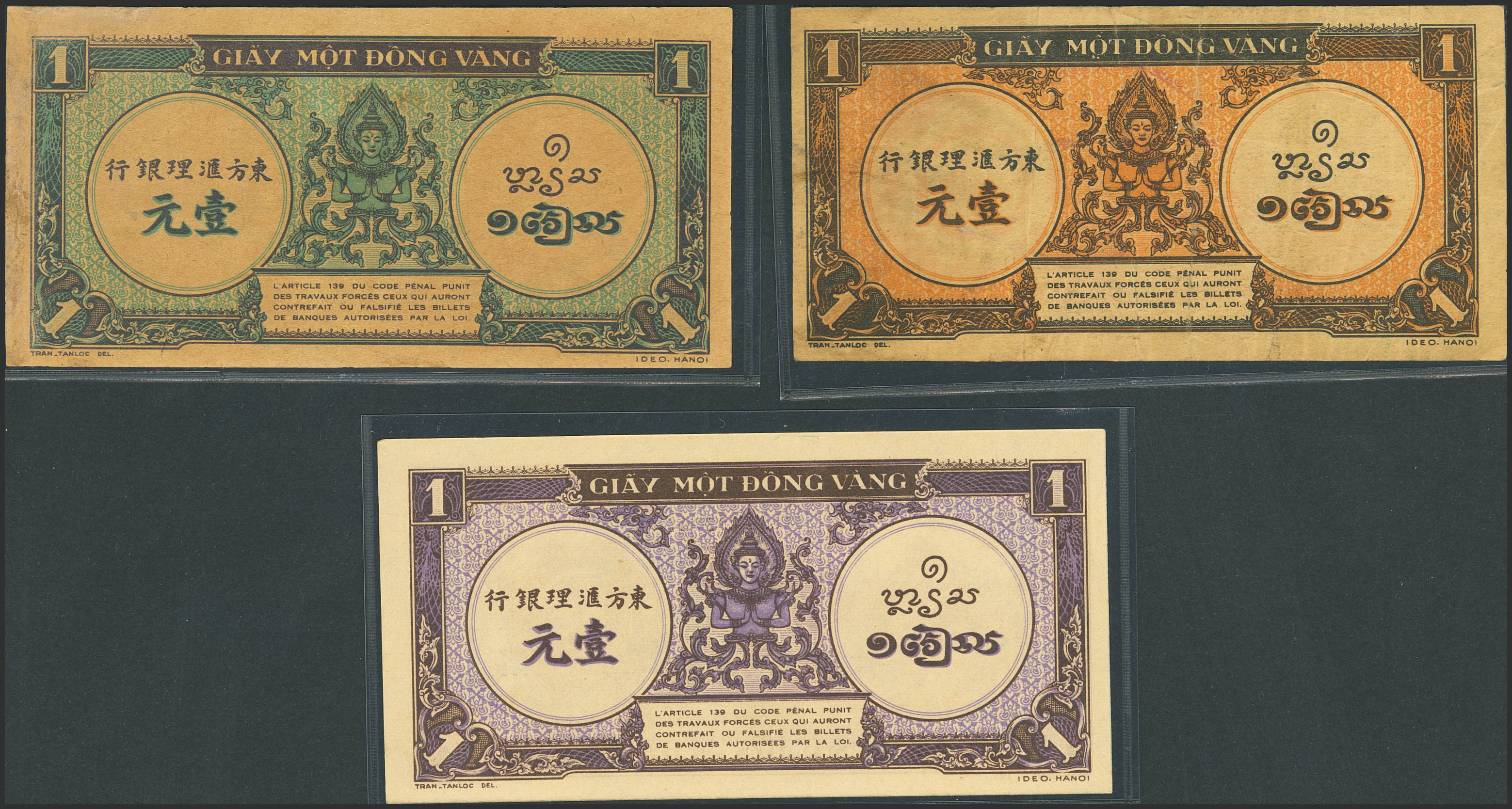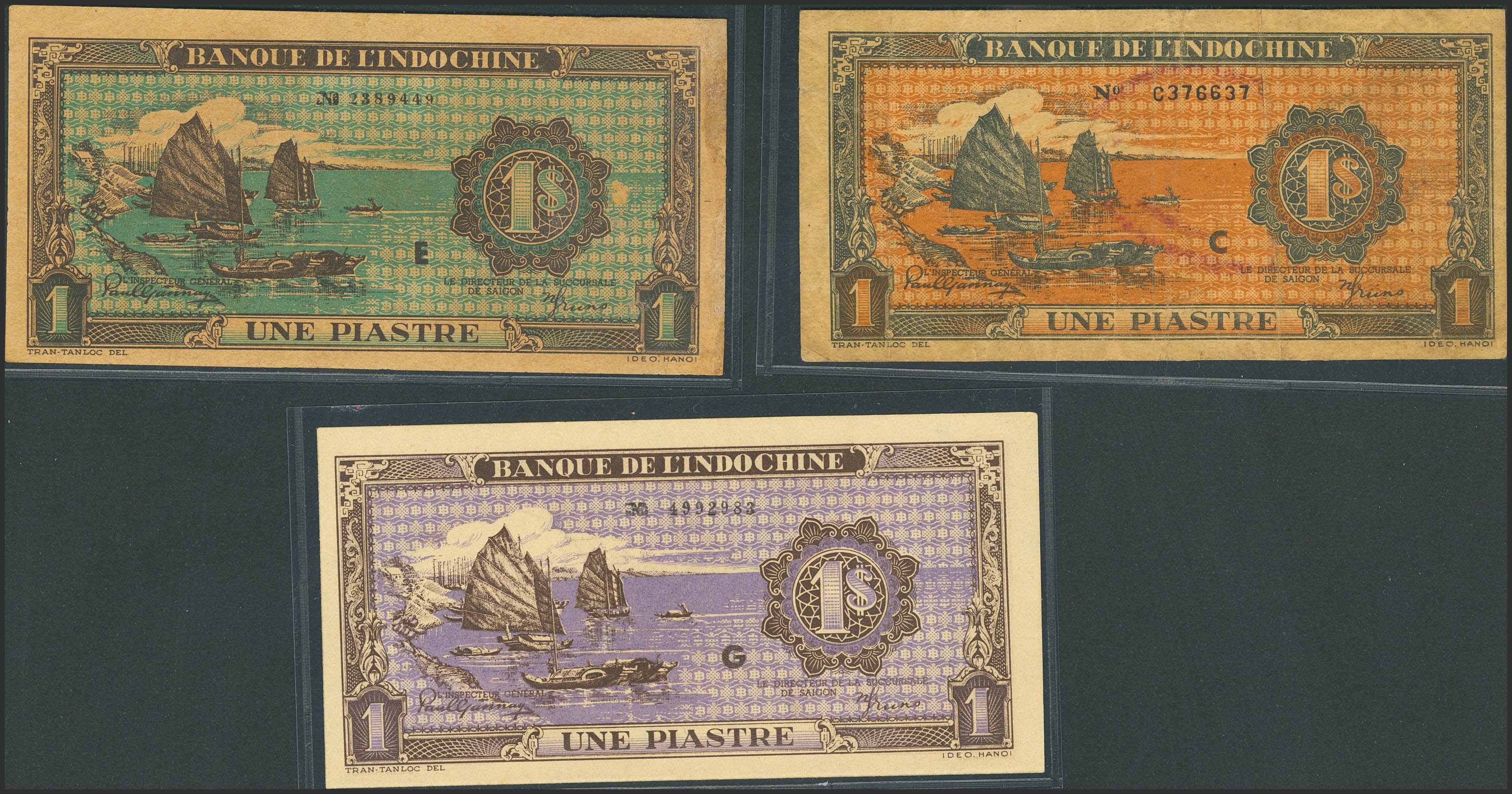 FRENCH INDOCHINA. Lot of 3 notes of 1 Piastre. (1942ca). Banque de L´Indochine. Orange, blue and purple. (Pick: 58c, 59a, 60). Very Fine (58c), Extremely Fine with the left edge restored (59a), Uncirculated (60), one of them restored.