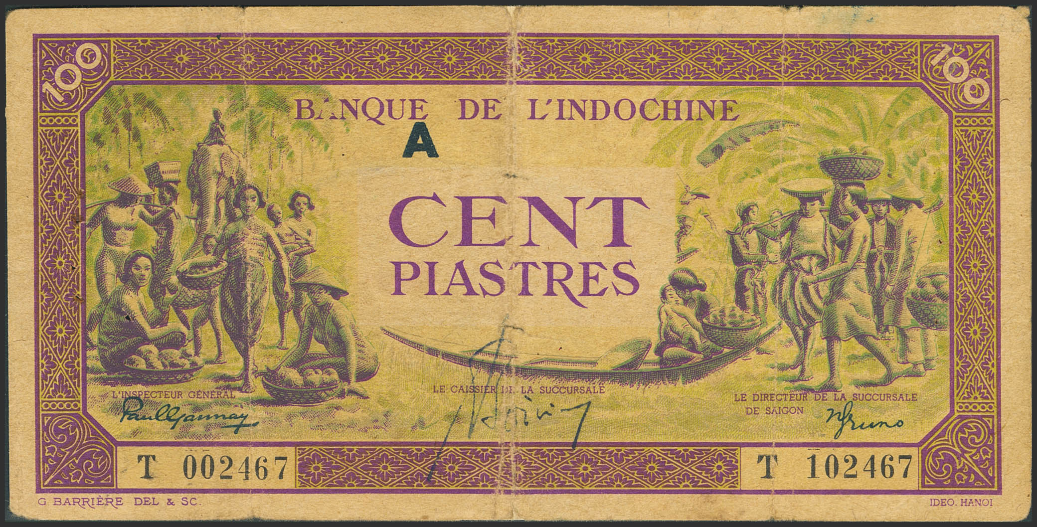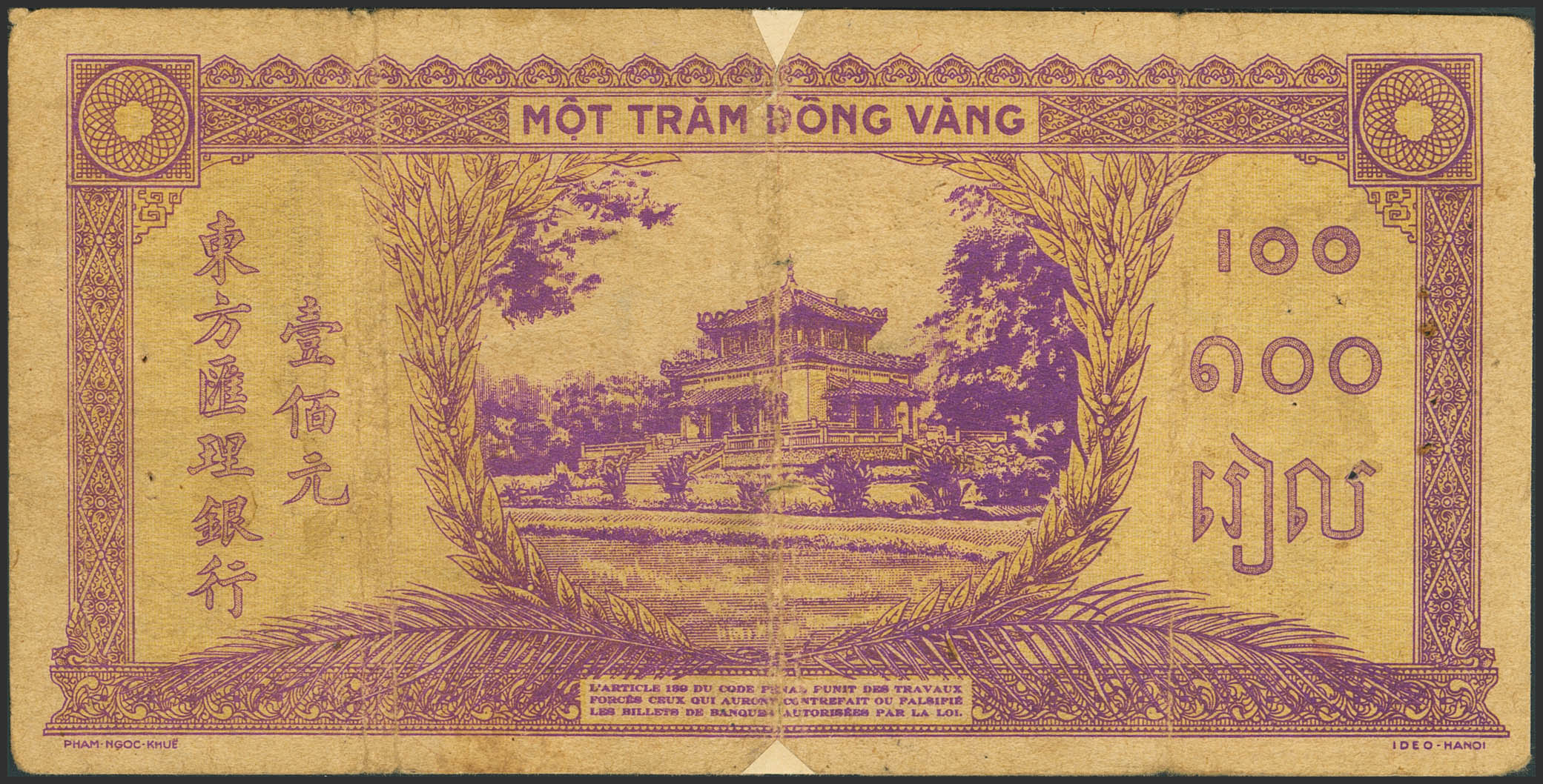 FRENCH INDOCHINA. 100 Piastres. (1942ca). Banque de L´Indochine. (Pick: 67). Fine, adhesive paper added over the tears on the central fold, pinholes.
