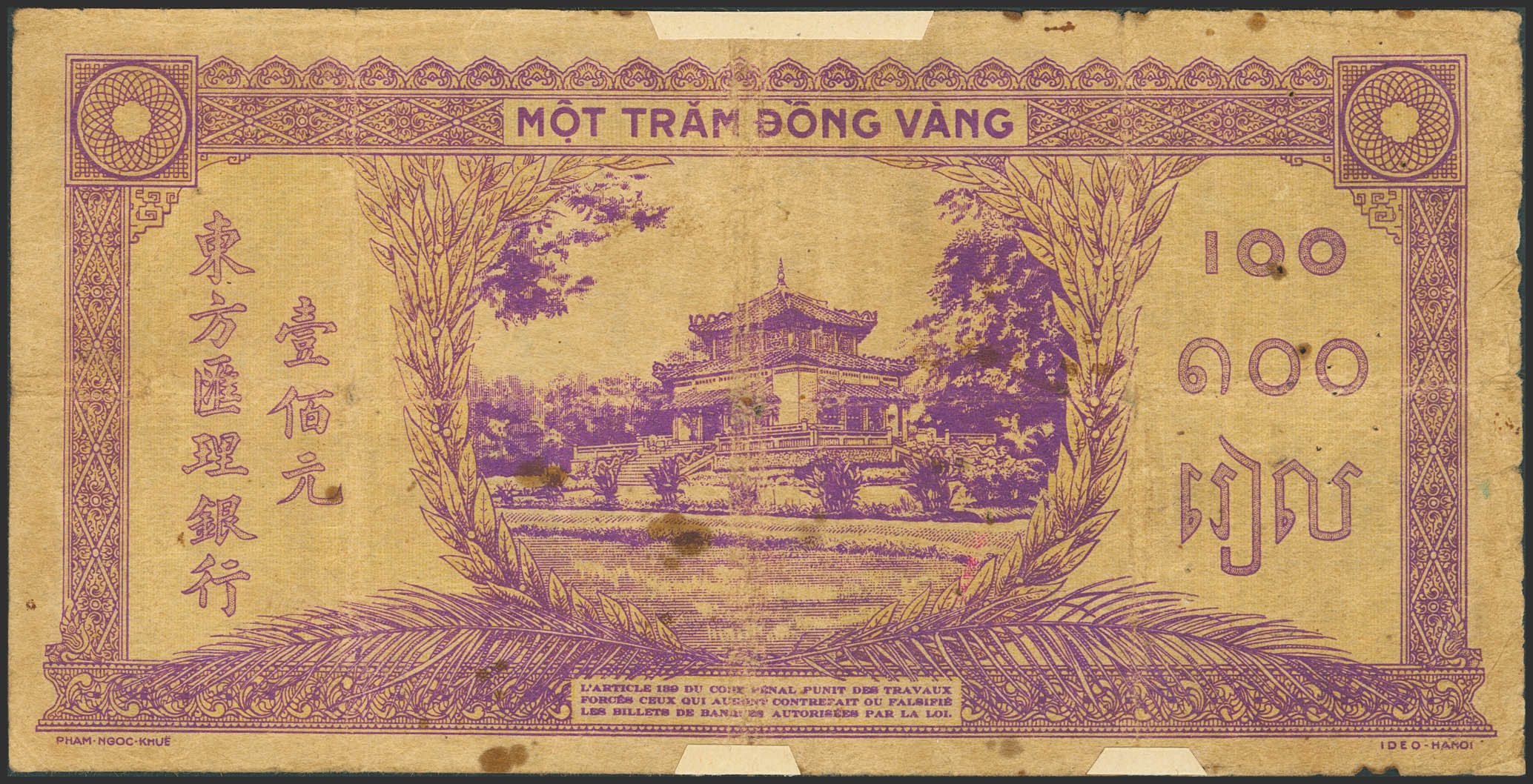 FRENCH INDOCHINA. 100 Piastres. (1942ca). Banque de L´Indochine. (Pick: 67). Fine, adhesive paper added over nicks on the edges, pinholes.